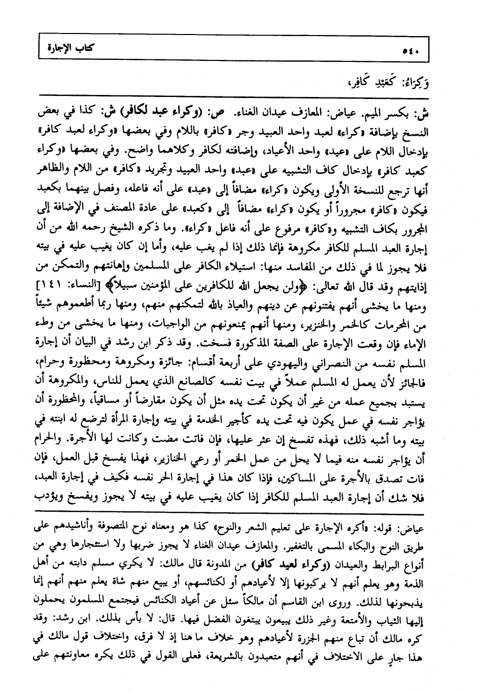ش: بكسر الميم عياض المعازف عيدان الغناء. ص: (وكراء عبد لكافر) ش: كذا في بعض النسخ بإضافة "كراء" لعبد واحد العبيد وجر "كافر" باللام، وفي بعضها "وكراء لعيد كافر" بإدخال اللام على "عيد" واحد الأعياد، وإضافته لكافر، وكلاهما واضح، وفي بعضها "وكراء كعبد كافر" بإدخال كاف التشبيه على "عبد" واحد العبيد وتجريد "كافر" من اللام، والظاهر: أنها ترجع للنسخة الأولى، ويكون "كراء" مضافا إلى "عبد" على أنه فاعله، وفصل بينهما بكعبد، فيكون "كافر" مجرورا، أو يكون "كراء" مضافا إلى "كعبد" على عادة المصنف في الإضافة إلى المجرور بكاف التشبيه، و"كافر" مرفوع على أنه فاعل "كراء". وما ذكره الشيخ - رحمه الله - من أن إجارة العبد المسلم للكافر مكروهة فإنما ذلك إذا لم يغب عليه. وأما إن كان يغيب عليه في بيته فلا يجوز لما في ذلك من المفاسد منها استيلاء الكافر على المسلمين وإهانتهم والتمكن من إذايتهم، وقد قال الله تعالى: {وَلَنْ يَجْعَلَ اللَّهُ لِلْكَافِرِينَ عَلَى الْمُؤْمِنِينَ سَبِيلاً} [النساء: 141] ومنها ما يخشى أنهم يفتنونهم عن دينهم والعياذ بالله لتمكنهم منهم، ومنها ربما أطعموهم شيئا من المحرمات كالخمر والخنزير، ومنها أنهم يمنعونهم من الواجبات، ومنها ما يخشى من وطء الإماء، فإن وقعت الإجارة على الصفة المذكورة فسخت، وقد ذكر ابن رشد في البيان أن إجارة المسلم نفسه من النصراني واليهودي على أربعة أقسام: جائزة ومكروهة ومحظورة وحرام، فالجائز لأن يعمل له المسلم عملا في بيت نفسه كالصانع الذي يعمل للناس والمكروهة أن يستبد بجميع عمله من غير أن يكون تحت يده مثل أن يكون مقارضا، أو مساقيا والمحظورة أن يؤاجر نفسه في عمل يكون فيه تحت يده كأجير الخدمة في بيته وإجارة المرأة لترضع له ابنته في بيته، وما أشبه ذلك فهذه تفسخ إن عثر عليها، فإن فاتت مضت، وكانت لها الأجرة، والحرام أن يؤاجر نفسه منه فيما لا يحل من عمل الخمر، أو رعي الخنازير فهذا يفسخ قبل العمل، فإن فات تصدق بالأجرة على المساكين، فإذا كان هذا في إجارة الحر نفسه، فكيف في إجارة العبد فلا شك أن إجارة العبد المسلم للكافر إذا كان يغيب عليه في بيته لا يجوز ويفسخ ويؤدب