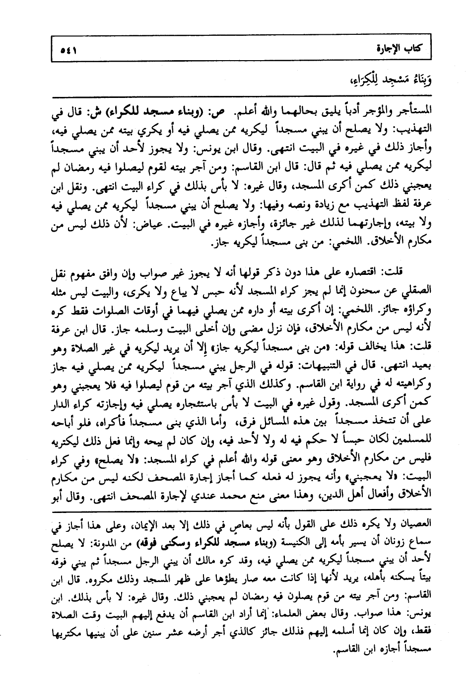 المستأجر والمؤجر أدبا يليق بحالهما والله أعلم. ص: (وبناء مسجد للكراء) ش: قال في التهذيب، ولا يصلح أن يبني مسجدا ليكريه ممن يصلي فيه، أو يكري بيته ممن يصلي فيه، وأجاز ذلك في غيره في البيت انتهى. وقال ابن يونس: ولا يجوز لأحد أن يبني مسجدا ليكريه ممن يصلي فيه، ثم قال: قال ابن القاسم: ومن آجر بيته لقوم ليصلوا فيه رمضان لم يعجبني ذلك كمن أكرى المسجد، وقال غيره: لا بأس بذلك في كراء البيت انتهى. ونقل ابن عرفة لفظ التهذيب مع زيادة، ونصه: وفيها، ولا يصلح أن يبني مسجدا ليكريه ممن يصلي فيه، ولا بيته وإجارتهما لذلك غير جائزة وأجازه غيره في البيت عياض؛ لأن ذلك ليس من مكارم الأخلاق اللخمي من بنى مسجدا ليكريه جاز.