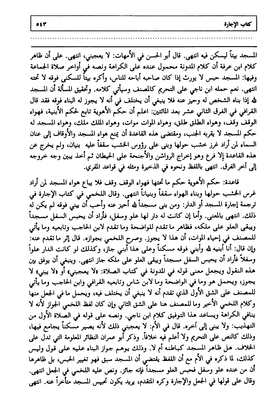 قاعدة: حكم الأهوية حكم ما تحتها فهواء الوقف وقف فلا يباع هواء المسجد لمن أراد غرس الخشب حولها، وبناء الهواء سقفا وبنيانا انتهى. وقال اللخمي في كتاب الإجارة في ترجمة إجارة المسجد، أو الدار ومن بنى مسجدا لله أحيز عنه، وأحب أن يبني فوقه لم يكن له ذلك انتهى بالمعنى. وأما إن كانت له دار لها علو وسفل، فأراد أن يحبس السفل مسجدا، ويبقي العلو على ملكه، فظاهر ما تقدم للواضحة، وما تقدم لابن الحاجب وتابعيه، وما يأتي للمصنف في إحياء الموات أن هذا لا يجوز وصرح اللخمي بجوازه قال إثر ما تقدم عنه: وإن قال: أنا أبنيه لله، وأبني فوقه مسكنا، وعلى هذا أبني جاز، وكذلك لو كانت الدار علوا وسفلا فأراد أن يحبس السفل مسجدا، ويبقي العلو على ملكه جاز انتهى. وينبغي أن يوفق بين هذه النقول، ويجعل معنى قوله في المدونة في كتاب الصلاة: "لا يعجبني"، أو "لا يبني" لا يجوز ويحمل هو، وما في الواضحة، وما لابن شاس وتابعيه القرافي وابن الحاجب، وما يأتي للمصنف على الشق الأول الذي تقدم أنه لا ينبغي أن يختلف فيه ويحمل ما في الجعل منها، وكلام اللخمي الأخير، وما للمصنف هنا على الشق الثاني، وإن كان لفظ اللخمي الجواز؛ لأنه لا ينافي الكراهة، ويساعد هذا التوفيق كلام ابن ناجي، ونصه: على قوله في الصلاة الأول من التهذيب، ولا يبني إلى آخره قال في الأم لا يعجبني ذلك؛ لأنه يصير مسكنا يجامع فيه، وذلك كالنص على التحريم، ولا أعلم فيه خلافا، وذكر أبو عمران النظائر المعلومة التي تدل على الخلاف هل ظاهر المسجد كباطنه أم لا ؟، وذلك يوهم جواز البناء عليه على قول، وليس كذلك لما ذكره في الأم مع أن اللفظ يقتضي أن المسجد سبق فهو تغيير الحبس بل ظاهرها أن من عنده علو وسفل فحبس العلو مسجدا فإنه جائز، ونص عليه اللخمي في الجعل انتهى. وقال على قولها في الجعل والإجارة: وكره المتقدم يريد يكون تحبيس المسجد متأخرا عنه انتهى.