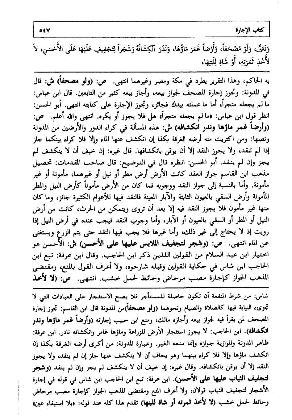 به الحاكم، وهذا التقرير يطرد في مكة ومصر وغيرهما انتهى. ص: (ولو مصحفا) ش: قال في المدونة: وتجوز إجارة المصحف لجواز بيعه، وأجاز بيعه كثير من التابعين قال ابن عباس: "ما لم يجعله متجرا" أما ما عملته بيدك فجائز، وتجوز الإجارة على كتابته انتهى. أبو الحسن انظر قول ابن عباس ما لم يجعله متجرا، هل فلا يجوز أو يكره؟ انتهى. والله أعلم. ص: (وأرضا غمر ماؤها وندر انكشافه) ش: هذه المسألة في كراء الدور والأرضين من المدونة ونصها: ومن اكتريت منه أرضه الغرقة بكذا إن انكشف عنها الماء، وإلا فلا كراء بينكما جاز إذا لم تنقد، ولا يجوز النقد إلا أن يوقن بانكشافها قال غيره: إن خيف أن لا ينكشف لم يجز، وإن لم ينقد أبو الحسن انظره قال في التوضيح قال صاحب المقدمات: تحصيل مذهب ابن القاسم جواز العقد كانت الأرض أرض مطر، أو نيل أو غيرهما مأمونة، أو غير مأمونة، وأما بالنسبة إلى جواز النقد ووجوبه فما كان من الأرض مأمونا كأرض النيل والمطر المأمونة وأرض السقي بالعيون الثابتة والآبار المعينة فالنقد فيها للأعوام الكثيرة جائز، وما كان منها غير مأمون فلا يجوز النقد فيه إلا بعد أن تروى، ويتمكن من الحرث كانت من أرض النيل أو المطر، أو السقي بالعيون والآبار، وأما وجوب النقد فيجب عنده في أرض النيل إذا رويت؛ إذ لا يحتاج إلى غير ذلك، وأما غيرها فلا يجب فيها النقد حتى يتم الزرع ويستغنى عن الماء انتهى. ص: (وشجر لتجفيف الملابس عليها على الأحسن) ش: الأحسن هو اختيار ابن عبد السلام من القولين اللذين ذكر ابن الحاجب، وقال ابن عرفة: تبع ابن الحاجب ابن شاس في حكاية القولين وقبله شارحوه، ولا أعرف القول بالمنع ومقتضى المذهب: الجواز كإجارة مصب مرحاض وحائط لحمل خشب انتهى. ص: (لا لأخذ