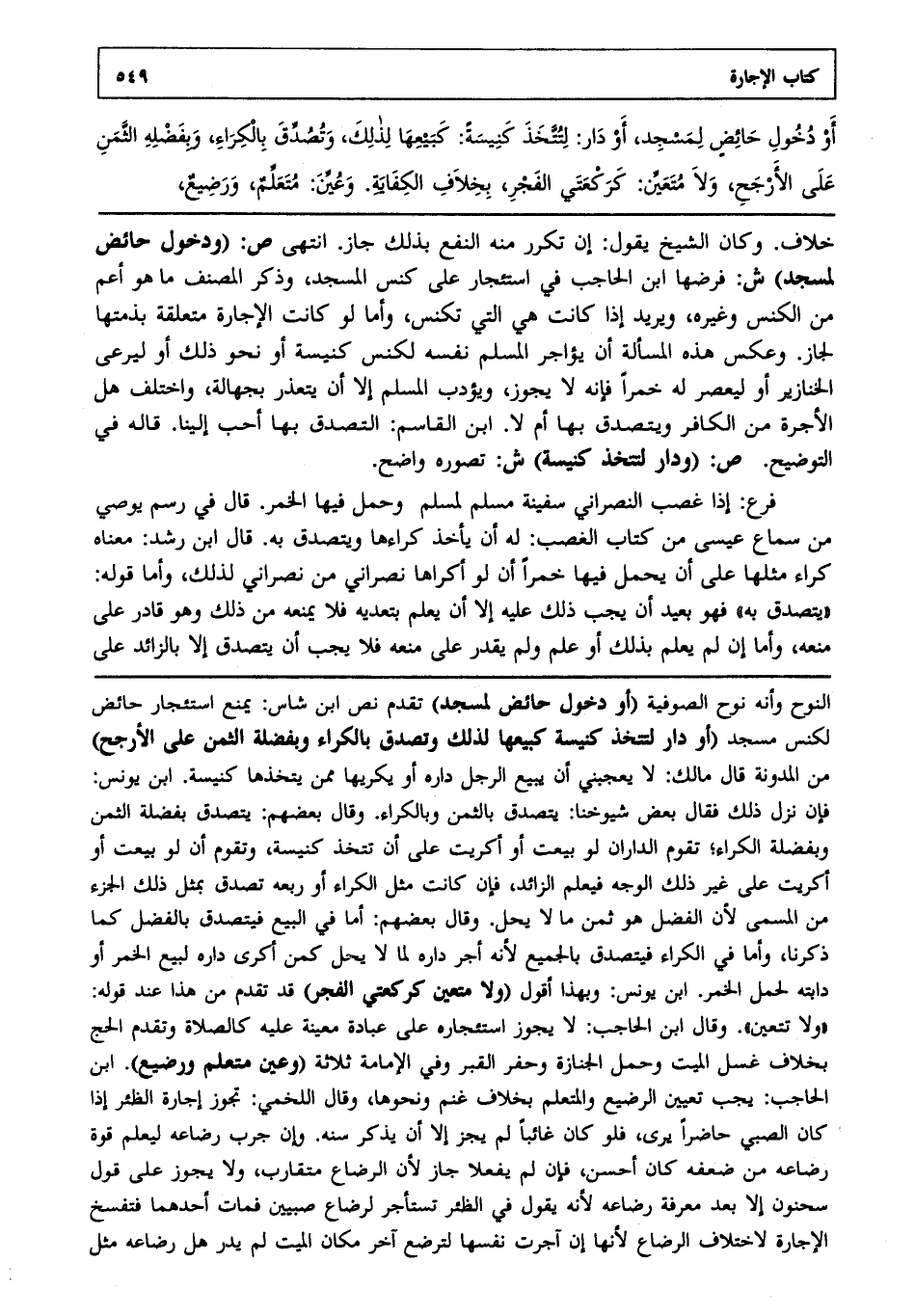 خلاف. وكان الشيخ يقول: إن تكرر منه النفع بذلك جاز انتهى. ص: (ودخول حائض لمسجد) ش: فرضها ابن الحاجب في استئجارها على كنس المسجد، وذكر المصنف ما هو أعم من الكنس وغيره، ويريد إذا كانت هي التي تكنس، وأما لو كانت الإجارة متعلقة بذمتها لجاز وعكس هذه المسألة أن يؤاجر المسلم نفسه لكنس كنيسة أو نحو ذلك، أو ليرعى الخنازير أو ليعصر له خمرا فإنه لا يجوز، ويؤدب المسلم إلا أن يتعذر بجهالة واختلف هل الأجرة من الكافر ويتصدق بها أم لا؟ ابن القاسم التصدق بها أحب إلينا قاله في التوضيح. ص: (ودار لتتخذ كنيسة) ش: تصوره واضح.