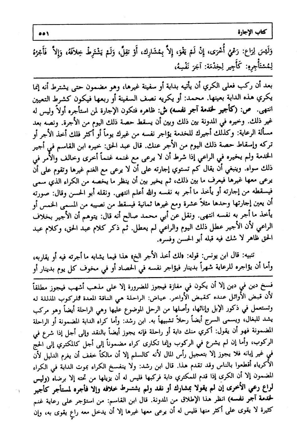 بعد أن ركب فعلى الكري أن يأتيه بدابة أو سفينة غيرها، وهو مضمون حتى يشترط أنه إنما يكري هذه الدابة بعينها محمد أو يكريه نصف السفينة، أو ربعها، فيكون كشرط التعيين انتهى. ص: (كأجير لخدمة آجر نفسه) ش: ظاهره فتكون الإجارة لمن استأجره أولا، وليس له غير ذلك، وخيره في المدونة بين ذلك وبين أن يسقط حصة ذلك اليوم من الأجرة، ونصه: بعد مسألة الرعاية، وكذلك أجيرك للخدمة يؤاجر نفسه من غيرك يوما، أو أكثر فلك أخذ الأجر، أو تركه وإسقاط حصة ذلك اليوم من الأجر عنك قال عبد الحق خيره ابن القاسم في أجير الخدمة، ولم يخيره في الراعي إذا شرط أن لا يرعى مع غنمه غنما أخرى وخالف، والأمر في ذلك سواء، وينبغي أن يقال: كم تستوي إجارته على أن لا يرعى مع الغنم غيرها، وتقوم على أن يرعى معها غيرها فيعرف ما بين ذلك، ثم يخير بين أن ينظر ما يخصه من الكراء الذي سمي فيسقطه من إجارته، أو يأخذ ما آجر به نفسه، والله أعلم. انتهى. ونقله أبو الحسن، وقال: صورته أن يعين إجارتها وحدها مثلا عشرة ومع غيرها ثمانية فيسقط من نصيبه من المسمى الخمس، أو يأخذ ما أجر به نفسه انتهى. ونقل عن أبي محمد صالح أنه قال يتوهم أن الأجير بخلاف الراعي؛ لأن الأجير عطل ذلك اليوم، والراعي لم يعطل، ثم ذكر كلام عبد الحق، وكلام عبد الحق ظاهر لا شك فيه قبله أبو الحسن وفسره.