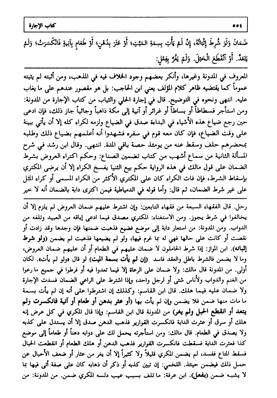 المعروف في المدونة وغيرها، وأنكر بعضهم وجود الخلاف فيه في المذهب، ومن أثبته لم يثبته عموما كما يقتضيه ظاهر كلام المؤلف يعني ابن الحاجب، بل هو مقصور عندهم على ما يغاب عليه انتهى. ونحوه في التوضيح قال في إجارة الحلي والثياب من كتاب الإجارة من المدونة: ومن استأجر فسطاطا، أو بساطا أو غرائر، أو آنية إلى مكة ذاهبا وجائيا جاز ذلك، فإن ادعى حين رجع ضياع هذه الأشياء في البداءة صدق في الضياع ولزمه الكراء كله إلا أن يأتي ببينة على وقت الضياع، فإن كان معه قوم في سفره فشهدوا أنه أعلمهم بضياع ذلك، وطلبه بمحضرهم حلف، وسقط عنه من يومئذ حصة باقي المدة انتهى. وقال ابن رشد في شرح المسألة الثانية من سماع أشهب من كتاب تضمين الصناع وحكم اكتراء العروض بشرط الضمان على قول مالك في هذه الرواية حكم بيع الثنيا يفسخ الكراء إلا أن يرضى المكتري بإسقاط الشرط، فإن فات الكراء كان على المكتري الأكثر من الكراء المسمى، أو كراء المثل على غير شرط الضمان، ثم قال: وأما قوله: في الدمياطية فيمن اكترى دابة بالضمان: إنه لا خير