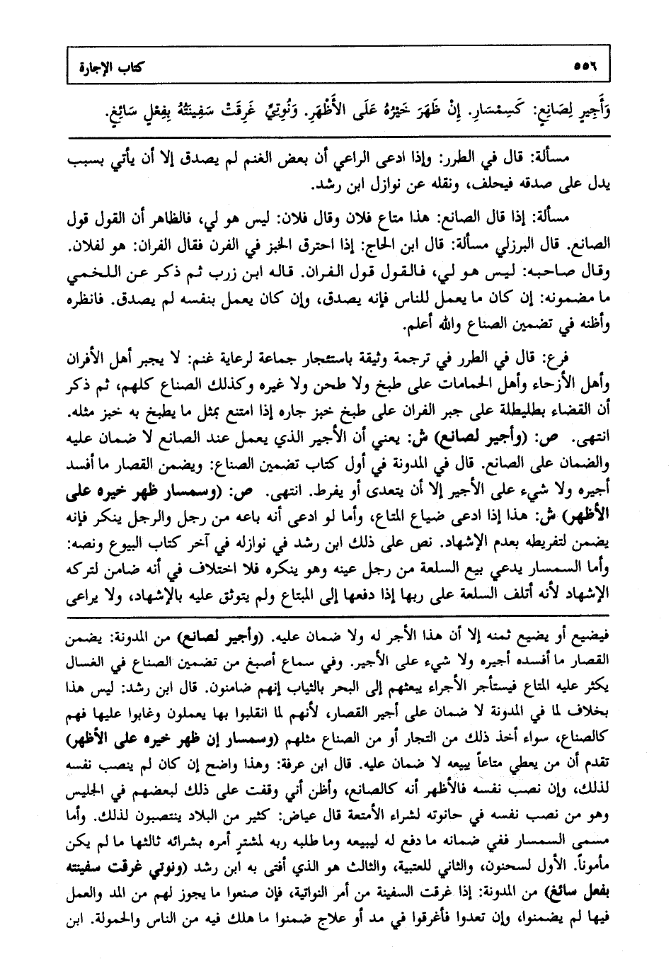 فرع: قال في الطرر في ترجمة وثيقة باستئجار جماعة لرعاية غنم: لا يجبر أهل الأفران وأهل الأزحاء وأهل الحمامات على طبخ، ولا طحن، ولا غيره، وكذلك الصناع كلهم، ثم ذكر أن القضاء بطليطلة على جبر الفران على طبخ خبز جاره إذا امتنع بمثل ما يطبخ به خبز مثله انتهى. ص: (وأجير لصانع) ش: يعني أن الأجير الذي يعمل عند الصانع لا ضمان عليه والضمان على الصانع قال في المدونة في أول كتاب تضمين الصناع: ويضمن القصار ما أفسد أجيره، ولا شيء على الأجير إلا أن يتعدى أو يفرط انتهى. ص: (وسمسار ظهر خيره على الأظهر) ش: هذا إذا ادعى ضياع المتاع، وأما لو ادعى أنه باعه من رجل، والرجل ينكر فإنه يضمن لتفريطه بعدم الإشهاد نص على ذلك ابن رشد في نوازله في آخر كتاب البيوع، ونصه: وأما السمسار يدعي بيع السلعة من رجل عينه، وهو ينكره فلا اختلاف في أنه ضامن لتركه الإشهاد؛ لأنه أتلف السلعة على ربها إذا دفعها إلى المبتاع، ولم يتوثق عليه بالإشهاد، ولا يراعى