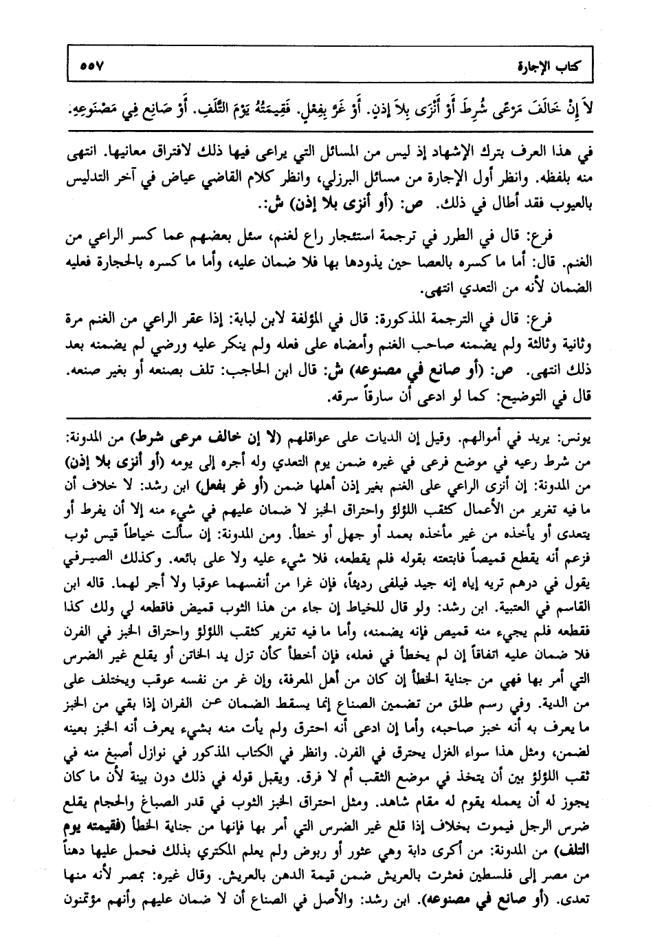 فرع: قال في الترجمة المذكورة قال في المؤلفة لابن لبابة إذا عقر الراعي من الغنم مرة ثانية وثالثة، ولم يضمنه صاحب الغنم وأمضاه على فعله، ولم ينكر عليه، ورضي لم يضمنه بعد ذلك انتهى. ص: (أو صانع في مصنوعه) ش: قال ابن الحاجب: تلف بصنعه أو بغير صنعه، قال في التوضيح: كما لو ادعى أن سارقا سرقه