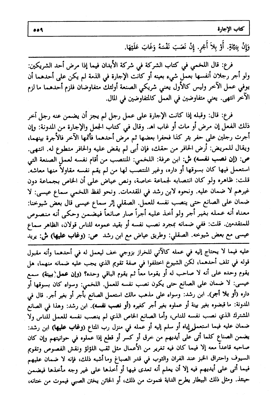 فرع: قال: وقبله: إذا كانت الإجارة على عمل رجل لم يجز أن يضمن عنه رجل آخر ذلك الفعل إن مرض أو مات، أو غاب ا هـ، وقال في كتاب الجعل والإجارة من المدونة: وإن أجرت رجلين على حفر بئر كذا فحفرا بعضها، ثم مرض أحدهما فأتمها الآخر فالأجرة بينهما، ويقال للمريض أرض الحافر من حقك، فإن أبى لم يقض عليه والحافر متطوع له انتهى. ص: (إن نصب نفسه) ش: ابن عرفة اللخمي المنتصب من أقام نفسه لعمل الصنعة التي استعمل فيها كان بسوقها، أو داره وغير المنتصب لها من لم يقم نفسه لها، ولا منها معاشه قلت: ظاهره، ولو كان انتصابه لجماعة خاصة ونص عياض على أن الخاص بجماعة دون غيرهم لا ضمان عليه، ونحوه لابن رشد في المقدمات ونحو لفظ اللخمي سماع عيسى: لا ضمان على الصانع حتى ينصب نفسه للعمل الصقلي إثر سماع عيسى قال بعض شيوخنا: معناه أنه عمله بغير أجر، ولو أخذ عليه أجرا صار صانعا فيضمن، وحكى أنه منصوص للمتقدمين قلت: ففي ضمانه بمجرد نصب نفسه أو بقيد عمومه للناس قولان الظاهر سماع عيسى مع بعض شيوخه الصقلي وطريق عياض مع ابن رشد. ص: (وغاب عليها) ش: يريد