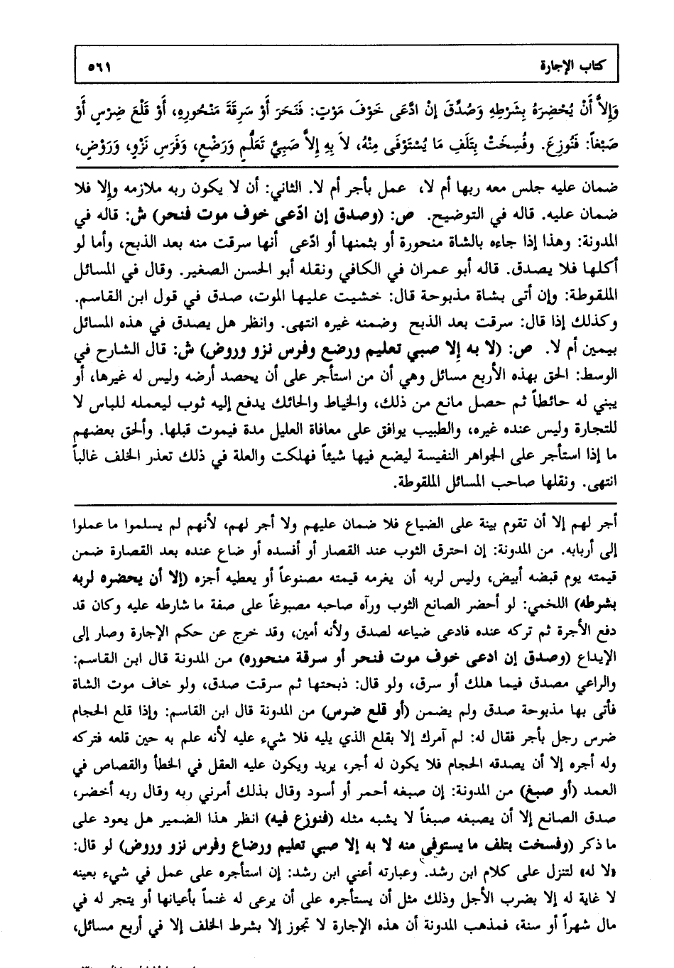 ضمان عليه جلس معه ربها أم لا؟ عمل بأجر أم لا؟ الثاني: أن لا يكون ربه ملازمه، وإلا فلا ضمان عليه قاله في التوضيح. ص: (وصدق إن ادعى خوف موت فنحر) ش: قاله في المدونة، وهذا إذا جاءه بالشاة منحورة، أو بثمنها، أو ادعى أنها سرقت منه بعد الذبح، وأما لو أكلها فلا يصدق قاله أبو عمران في الكافي، ونقله أبو الحسن الصغير، وقال في المسائل الملقوطة: وإن أتى بشاة مذبوحة قال: خشيت عليها الموت صدق في قول ابن القاسم، وكذلك إذا قال سرقت بعد الذبح وضمنه غيره انتهى. وانظر هل يصدق في هذه المسائل بيمين أم لا. ص: (لا به إلا صبي تعليم ورضاع وفرس نزو وروض) ش: قال الشارح في الوسط الحق بهذه الأربع مسائل، وهي: أن من استأجر على أن يحصد أرضه، وليس له غيرها، أو يبني له حائطا، ثم حصل مانع من ذلك والخياط والحائك يدفع إليه ثوب ليعمله للباس لا للتجارة، وليس عنده غيره، والطبيب يوافق على معافاة العليل مدة فيموت قبلها وألحق بعضهم ما إذا استأجر على الجواهر النفيسة ليضع فيها شيئا فهلكت والعلة في ذلك تعذر الخلف غالبا انتهى. ونقلها صاحب المسائل الملقوطة.