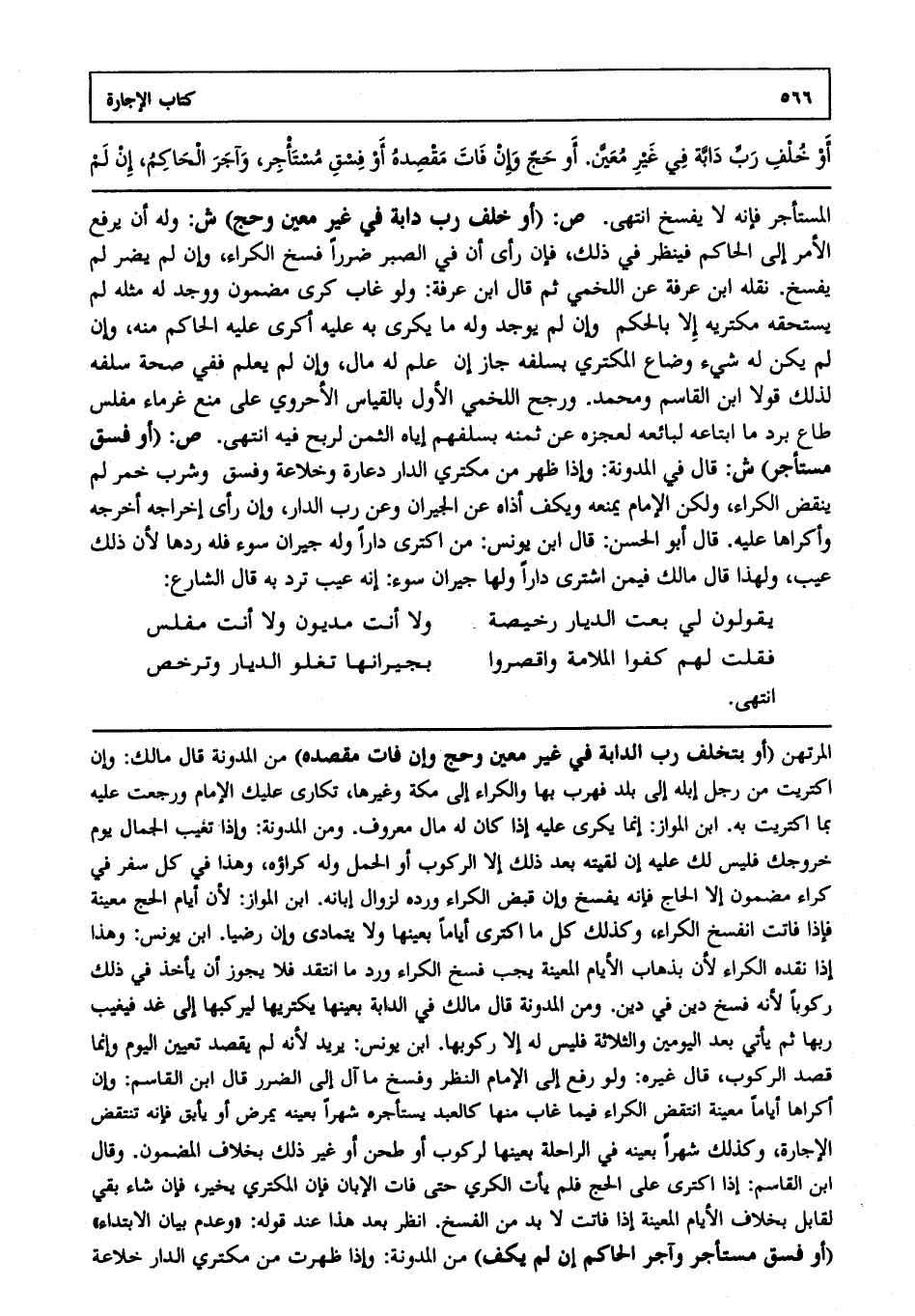 المستأجر فإنه لا يفسخ انتهى. ص: (أو خلف رب دابة في غير معين وحج) ش: وله أن يرفع الأمر إلى الحاكم فينظر في ذلك، فإن رأى أن في الصبر ضررا فسخ الكراء، وإن لم يضر لم يفسخ نقله ابن عرفة عن اللخمي، ثم قال ابن عرفة: ولو غاب كرى مضمون ووجد له مثله لم يستحقه مكتريه إلا بالحكم، وإن لم يوجد، وله ما يكرى به عليه أكرى عليه الحاكم منه، وإن لم يكن له شيء وضاع المكترى بسلفه جاز إن علم له مال، وإن لم يعلم ففي صحة سلفه لذلك قولا ابن القاسم ومحمد ورجح اللخمي الأول بالقياس الأحروي على منع غرماء مفلس طاع برد ما ابتاعه لبائعه لعجزه عن ثمنه بسلفهم إياه الثمن لربح فيه انتهى. ص: (أو فسق مستأجر) ش: قال في المدونة، وإذا ظهر من مكتري الدار دعارة وخلاعة وفسق وشرب خمر لم ينقض الكراء ولكن الإمام يمنعه ويكف أذاه عن الجيران، وعن رب الدار، وإن رأى إخراجه أخرجه، وأكراها عليه قال أبو الحسن قال ابن يونس من اكترى دارا، وله جيران سوء فله ردها؛ لأن ذلك عيب ولهذا قال مالك فيمن اشترى دارا ولها جيران سوء: إنه عيب ترد به قال الشاعر: