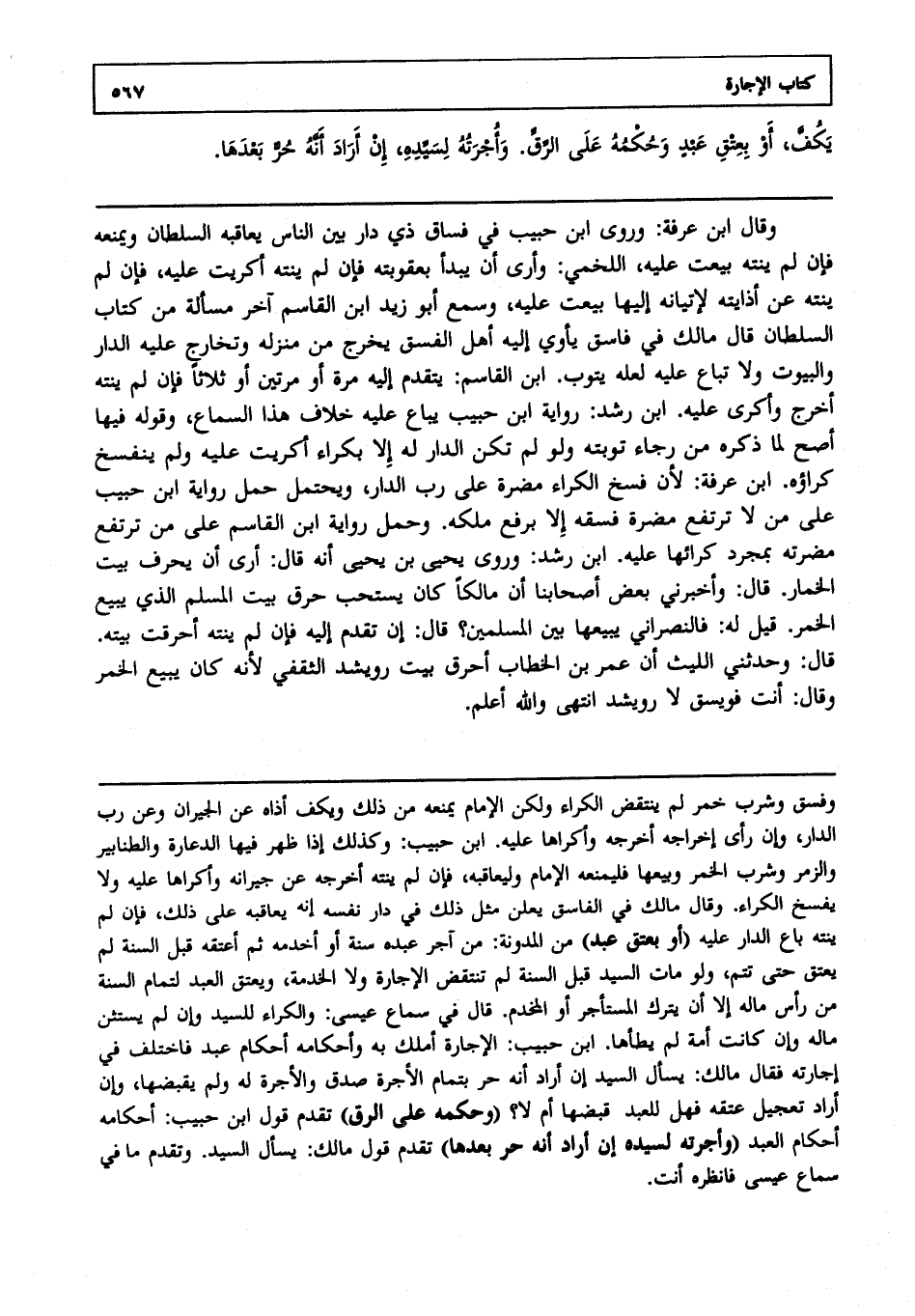 وقال ابن عرفة: وروى ابن حبيب في فاسق ذي دار بين الناس يعاقبه السلطان ويمنعه، فإن لم ينته بيعت عليه اللخمي وأرى أن يبدأ بعقوبته، فإن لم ينته أكريت عليه، فإن لم ينته عن إذايته لإتيانه إليها بيعت عليه وسمع أبو زيد ابن القاسم آخر مسألة من كتاب السلطان قال مالك في فاسق يأوي إليه أهل الفسق يخرج من منزله وتخارج عليه الدار والبيوت، ولا تباع عليه لعله يتوب ابن القاسم يتقدم إليه مرة، أو مرتين، أو ثلاثا، فإن لم ينته أخرج وأكري عليه ابن رشد رواية ابن حبيب يباع عليه خلاف هذا السماع وقوله فيها أصح لما ذكره من رجاء توبته، ولو لم تكن الدار له إلا بكراء أكريت عليه، ولم ينفسخ كراؤه ابن عرفة؛ لأن فسخ الكراء مضرة على رب الدار ويحتمل حمل رواية ابن حبيب على من لا ترتفع مضرة فسقه إلا برفع ملكه وحمل رواية ابن القاسم على من ترتفع مضرته بمجرد كرائها عليه ابن رشد وروى يحيى بن يحيى أنه قال: أرى أن يحرق بيت الخمار قال وأخبرني بعض أصحابنا أن مالكا كان يستحب حرق بيت المسلم الذي يبيع الخمر قيل له فالنصراني يبيعها بين المسلمين؟ قال: إن تقدم إليه، فإن لم ينته أحرقت بيته قال وحدثني الليث أن عمر بن الخطاب أحرق بيت رويشد الثقفي؛ لأنه كان يبيع الخمر، وقال: أنت فويسق لا رويشد انتهى. والله أعلم.