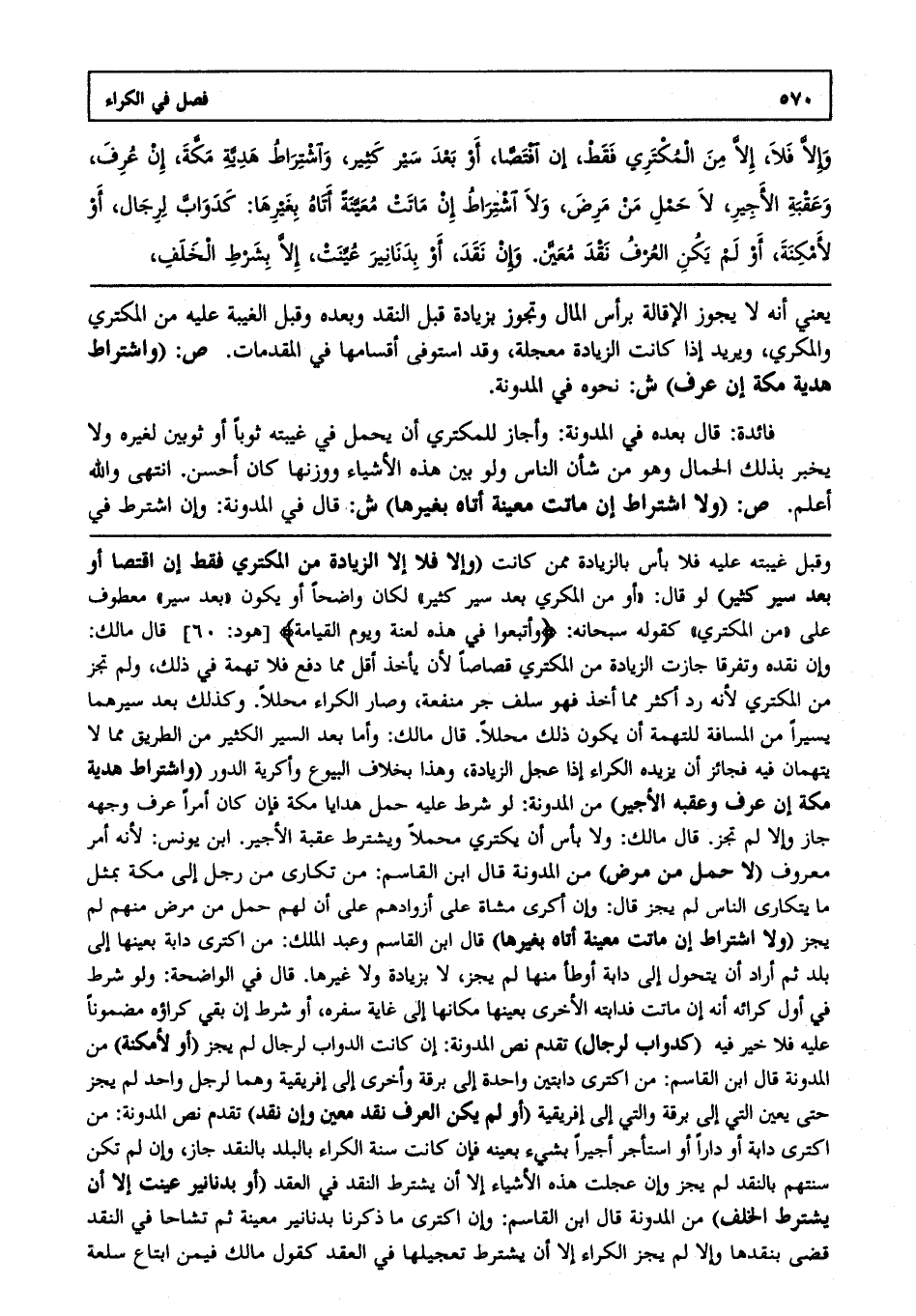 وإلا فلا، إلا من المكتري فقط، إن افتصا، أو بعد سير كثير، واشتراط هدية مكة، إن عرف، وعقبة الأجير، لا حمل من مرض، ولا اشتراط إن ماتت معينة أتاه بغيرها: كدواب لرجال، أو لأمكنة، أو لم يكن العرف نقد معين. وإن نقد، أو بدنانير عينت، إلا بشرط الخلف،