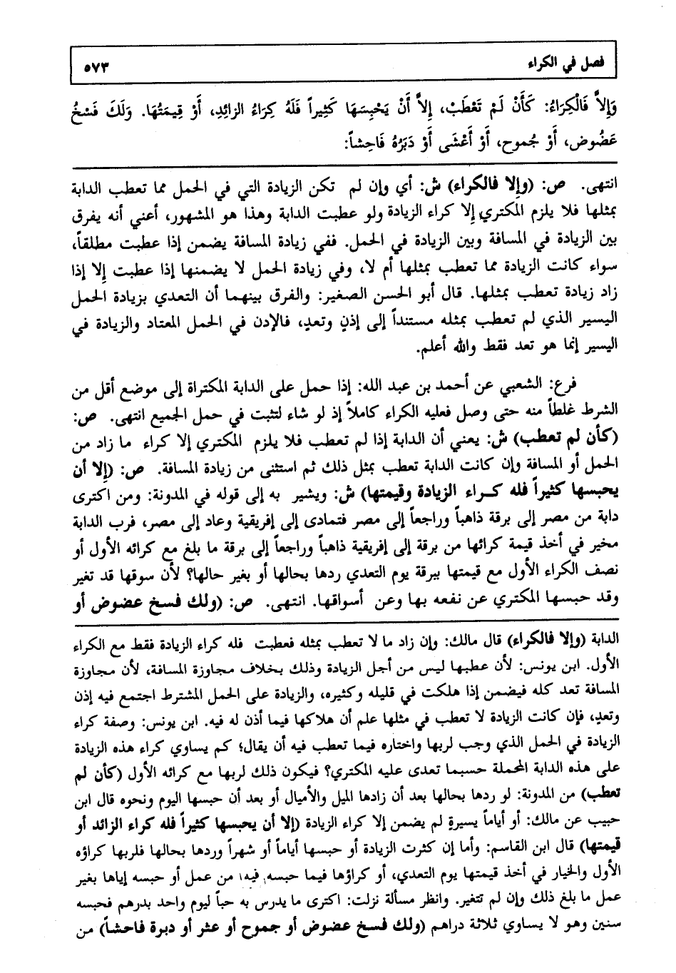 انتهى. ص: (وإلا فالكراء) ش: أي، وإن لم تكن الزيادة التي في الحمل مما تعطب الدابة بمثلها فلا يلزم المكتري إلا كراء الزيادة، ولو عطبت الدابة، وهذا هو المشهور أعني أنه يفرق بين الزيادة في المسافة وبين الزيادة في الحمل ففي زيادة المسافة يضمن إذا عطبت مطلقا سواء كانت الزيادة مما تعطب بمثلها أم لا، وفي زيادة الحمل لا يضمنها إذا عطبت إلا إذا زاد زيادة تعطب بمثلها قال أبو الحسن الصغير: والفرق بينهما أن التعدي بزيادة الحمل اليسير الذي لم تعطب بمثله مستند إلى إذن وتعد فالإذن في الحمل المعتاد، والزيادة في اليسير إنما هو تعد فقط، والله أعلم.