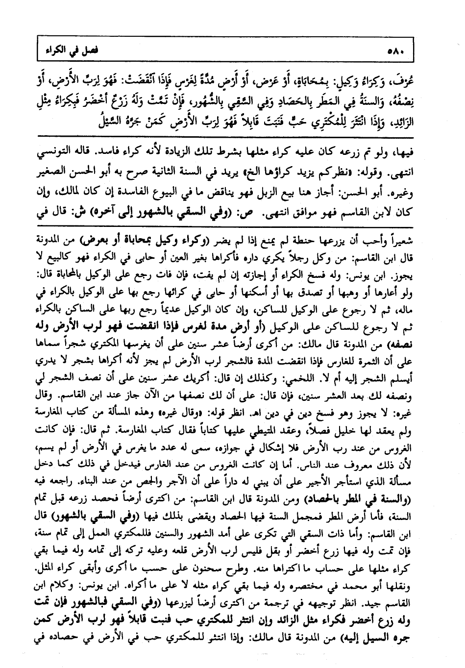 فيها، ولو تم زرعه كان عليه كراء مثلها بشرط تلك الزيادة؛ لأنه كراء فاسد قاله التونسي انتهى. وقوله: "نظر كم يزيد كراؤها إلخ" يريد في السنة الثانية صرح به أبو الحسن الصغير وغيره أبو الحسن أجاز هنا بيع الزبل فهو يناقض ما في البيوع الفاسدة إن كان لمالك، وإن كان لابن القاسم فهو موافق انتهى. ص: (وفي السقي بالشهور إلى آخره) ش: قال في