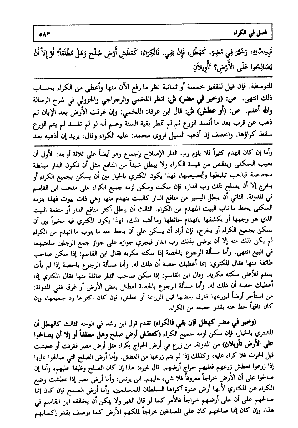 المتوسطة، فإن قيل للفقير خمسة، أو ثمانية نظر ما رفع الآن منها وأعطى من الكراء بحساب ذلك انتهى. ص: (وخير في مضر) ش: انظر اللخمي والرجراجي والجزولي في شرح الرسالة، والله أعلم. ص: (أو عطش) ش: قال ابن عرفة اللخمي، وإن غرقت الأرض بعد الإبان، ثم ذهب عن قرب بعد ما أفسد الزرع، ثم لم تمطر بقية السنة، وعلم أنه لو لم تفسد لم يتم الزرع سقط كراؤها، واختلف إن أذهبه السيل فروى محمد عليه الكراء، وقال: يريد إن أذهبه بعد