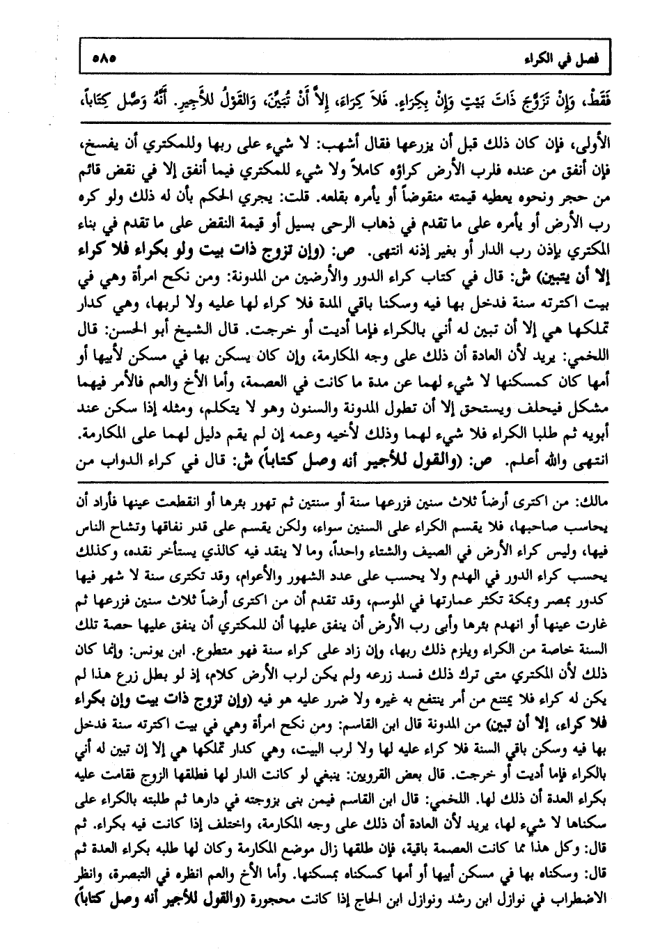 الأولى، فإن كان ذلك قبل أن يزرعها فقال أشهب: لا شيء على ربها، وللمكتري أن يفسخ، فإن أنفق من عنده فلرب الأرض كراؤه كاملا، ولا شيء للمكتري فيما أنفق إلا في نقص قائم من حجر ونحوه يعطيه قيمته منقوضا، أو يأمره بقلعه قلت: يجري الحكم بأن له ذلك، ولو كره رب الأرض، أو يأمره على ما تقدم في ذهاب الرحى بسيل، أو قيمة النقض على ما تقدم في بناء المكتري بإذن رب الدار، أو بغير إذنه انتهى. ص: (وإن تزوج ذات بيت، ولو بكراء فلا كراء إلا أن يتبين) ش: قال في كتاب كراء الدور والأرضين من المدونة: ومن نكح امرأة، وهي في بيت اكترته سنة فدخل بها فيه، وسكنا باقي المدة فلا كراء لها عليه، ولا لربها، وهي كدار تملكها هي إلا أن تبين له أني بالكراء فإما أديت أو خرجت، قال الشيخ أبو الحسن: قال اللخمي: يريد؛ لأن العادة أن ذلك على وجه المكارمة، وإن كان يسكن بها في مسكن لأبيها، أو أمها كان كمسكنها لا شيء لهما عن مدة ما كانت في العصمة، وأما الأخ والعم فالأمر فيهما مشكل فيحلف ويستحق إلا أن تطول المدة والسنون، وهو لا يتكلم، ومثله إذا سكن عند أبويه، ثم طلبا الكراء فلا شيء لهما، وذلك لأخيه وعمه إن لم يقم دليل لهما على المكارمة انتهى. والله أعلم. ص: (والقول للأجير أنه وصل كتابا) ش: قال في كراء الدواب من