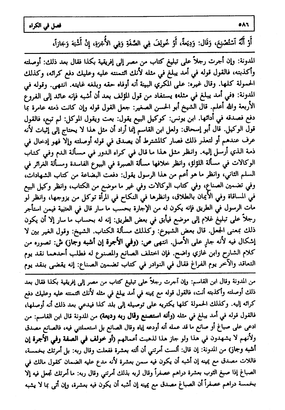 المدونة: وإن أجرت رجلا على تبليغ كتاب من مصر إلى إفريقية بكذا فقال بعد ذلك أوصلته وأكذبته فالقول قوله: في أمد يبلغ في مثله؛ لأنك ائتمنته عليه، وعليك دفع كرائه، وكذلك الحمولة كلها، وقال غيره: على المكري البينة أنه أوفاه حقه، وبلغه غايته انتهى. وقوله: في المدونة: "في أمد يبلغ في مثله" يستفاد من قول المؤلف بعد أن أشبه فإنه عائد إلى الفروع الأربعة والله أعلم. قال الشيخ أبو الحسن الصغير: جعل القول قوله، وإن كانت ذمته عامرة بما دفع فصدقه في أدائها ابن يونس كوكيل البيع يقول: بعت ويقول الموكل: لم تبع فالقول قول الوكيل قال أبو إسحاق: ولعل ابن القاسم إنما أراد أن مثل هذا لا يحتاج إلى إثبات؛ لأنه عرف عندهم أو لتعذر ذلك فصار كالمشترط أن يصدق في قوله: أوصلته، وإلا فهو إدخال في ذمة الذي أرسل إليه وانظر مثل هذا ما قال في كراء الدور في مسألة الدم، وفي كتاب الوكالات في مسألة اللؤلؤ وانظر خلافها مسألة الصبرة في البيوع الفاسدة ومسألة الغرائر في السلم الثاني، وانظر ما هو أعم من هذا الرسول يقول: دفعت البضاعة من كتاب الشهادات، وفي تضمين الصناع، وفي كتاب الوكالات، وفي غير ما موضع من الكتاب وانظر وكيل البيع في المساقاة، وفي الأيمان بالطلاق، وانظرها في النكاح في المرأة توكل من يزوجها، وانظر لو مات الرسول في الطريق فإنه يكون له من الإجارة بحسب ما سار قال في العتبية فيمن استأجر رجلا على تبليغ غلام إلى موضع فيأبق في بعض الطريق: إنه له بحساب ما سار إلا أن يكون ذلك بمعنى الجعل قال بعض الشيوخ، وكذلك مسألة الكتاب الشيخ وقول الغير بين لا إشكال فيه؛ لأنه جار على الأصل انتهى. ص: (وفي الأجرة إن أشبه وجاز) ش: تصوره من كلام الشارح وابن غازي واضح، فإن اختلف الصانع والمصنوع له فطلب أحدهما نقد يوم التعاقد، والآخر يوم الفراغ فقال في النوادر في كتاب تضمين الصناع: إنه يقضي بنقد يوم
