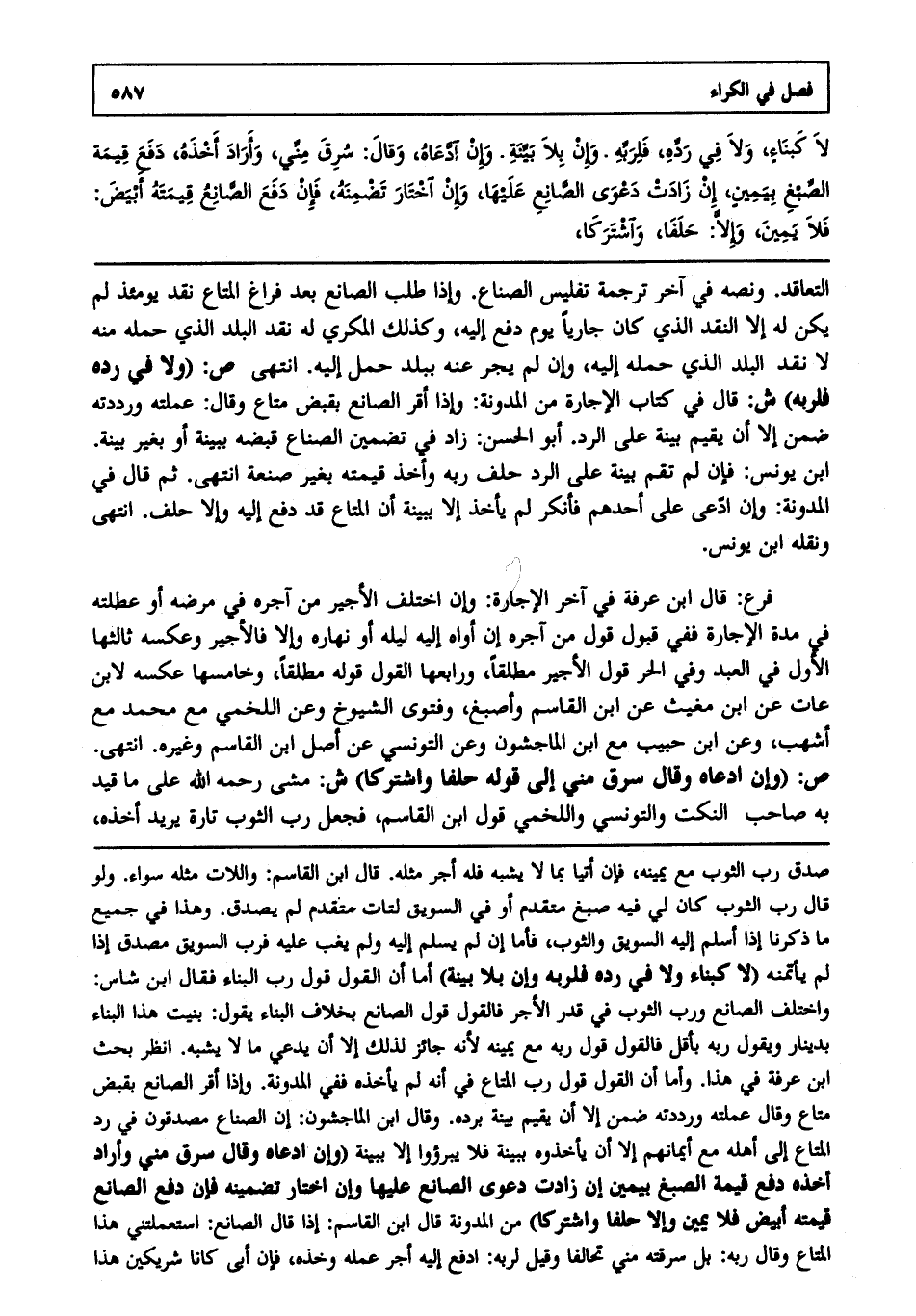 التعاقد. ونصه في آخر ترجمة تفليس الصناع. وإذا طلب الصانع بعد فراغ المتاع نقد يومئذ لم يكن له إلا النقد الذي كان جاريا يوم دفع إليه، وكذلك المكري له نقد البلد الذي حمله منه لا نقد البلد الذي حمله إليه، وإن لم يجر عنه ببلد حمل إليه انتهى. ص: (ولا في رده فلربه) ش: قال في كتاب الإجارة من المدونة: وإذا أقر الصانع بقبض متاع، وقال: عملته ورددته ضمن إلا أن يقيم بينة على الرد أبو الحسن زاد في تضمين الصناع قبضه ببينة أو بغير بينة ابن يونس، فإن لم تقم بينة على الرد حلف ربه وأخذ قيمته بغير صنعة انتهى. ثم قال في المدونة: وإن ادعي على أحدهم فأنكر لم يأخذ إلا ببينة أن المتاع قد دفع إليه، وإلا حلف انتهى. ونقله ابن يونس