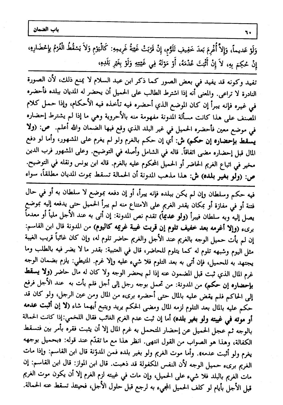 تفيد وكونه قد يفيد في بعض الصور كما ذكر ابن عبد السلام لا يمنع ذلك؛ لأن الصورة النادرة لا تراعى، والمعنى أنه إذا اشترط الطالب على الحميل أن يحضر له المديان ببلده فأحضره في غيره؛ فإنه يبرأ إن كان الموضع الذي أحضره فيه تأخذه فيه الأحكام وإذا حمل كلام المصنف على هذا كانت مسألة المدونة مفهومة منه بالأحروية وهي ما إذا لم يشترط إحضاره في موضع معين فأحضره الحميل في غير البلد الذي وقع فيها الضمان، والله أعلم. ص: (ولا يسقط بإحضاره إن حكم) ش: أي إن حكم بالغرم ولو لم يغرم على المشهور، وأما لو دفع المال قبل إحضاره مضى اتفاقا قاله في الشامل، وأصله في التوضيح وعلى المشهور فرب الدين مخير في اتباع الغريم الحاضر، أو الحميل المحكوم عليه بالغرم قاله ابن يونس، ونقله في التوضيح. ص: (ولو بغير بلده) ش: هذا مذهب المدونة أن الحمالة تسقط بموت المديان مطلقا سواء