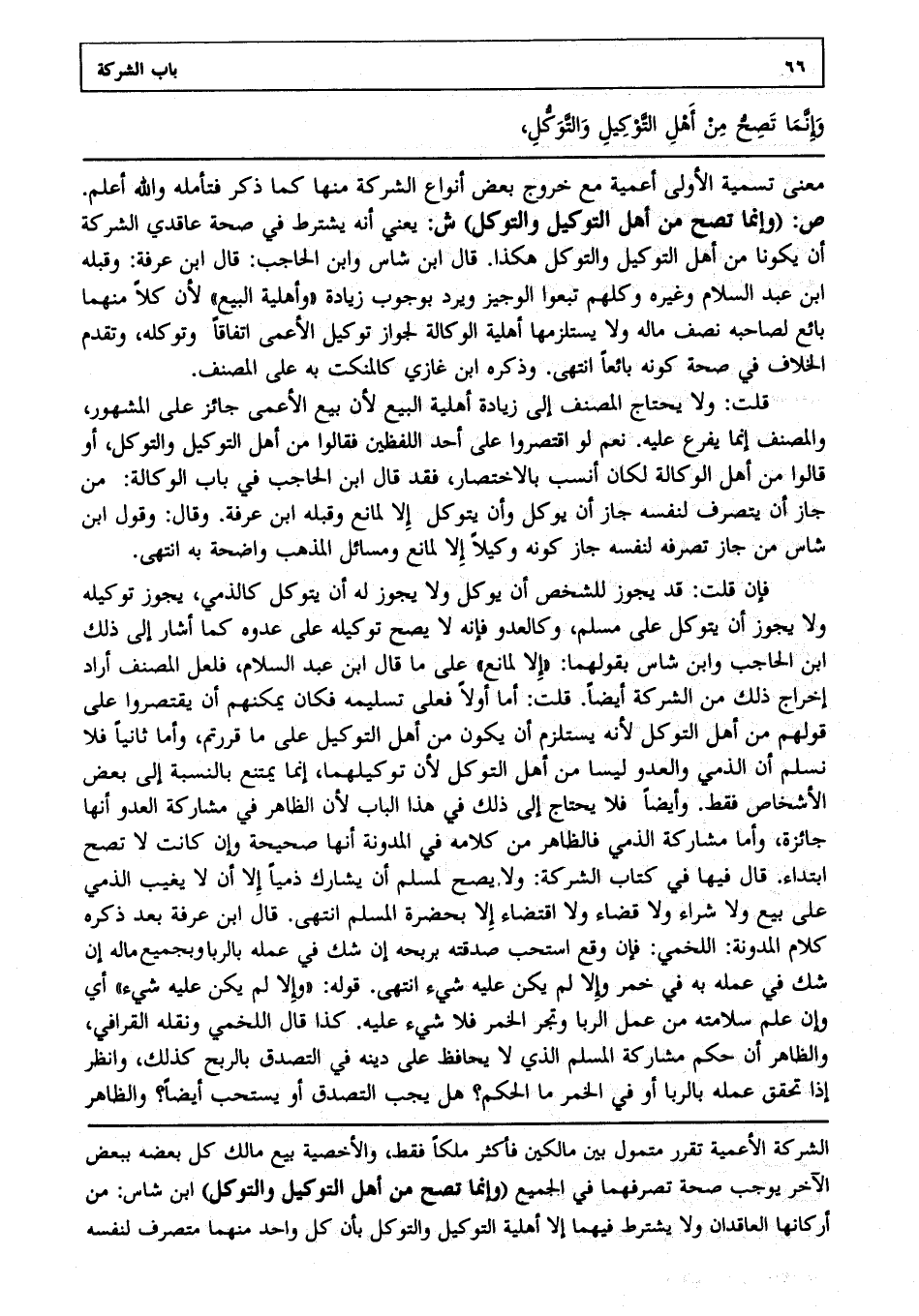 معنى تسمية الأولى أعمية مع خروج بعض أنواع الشركة منها كما ذكر فتأمله، والله أعلم. ص: (وإنما تصح من أهل التوكيل والتوكل) ش: يعني أنه يشترط في صحة عاقدي الشركة أن يكونا من أهل التوكيل والتوكل هكذا قال ابن شاس وابن الحاجب قال ابن عرفة: وقبله ابن عبد السلام وغيره وكلهم تبعوا الوجيز ويرد بوجوب زيادة "وأهلية البيع" لأن كلا منهما بائع لصاحبه نصف ماله ولا يستلزمها أهلية الوكالة لجواز توكيل الأعمى اتفاقا وتوكله وتقدم الخلاف في صحة كونه بائعا انتهى وذكره ابن غازي كالمنكت به على المصنف.