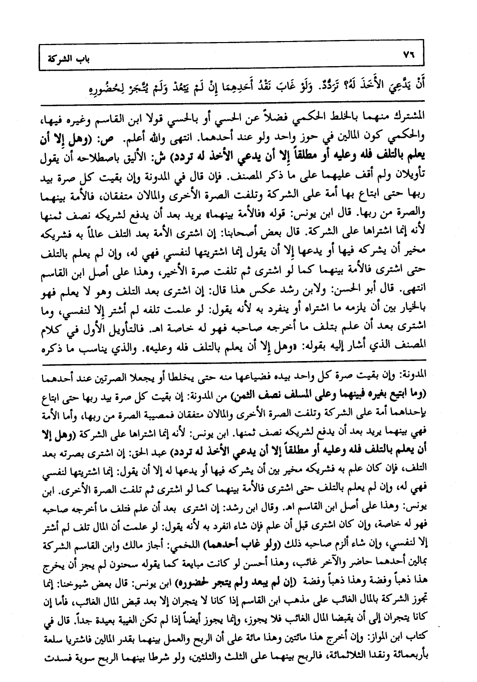 المشترك منهما بالخلط الحكمي فضلا عن الحسي، أو بالحسي قولا ابن القاسم وغيره فيها والحكمي كون المالين في حوز واحد، ولو عند أحدهما انتهى، والله أعلم. ص: (وهل إلا أن يعلم بالتلف فله وعليه، أو مطلقا إلا أن يدعي الأخذ له تردد) ش: الأليق باصطلاحه أن يقول تأويلان ولم أقف عليهما على ما ذكر المصنف فإن قال في المدونة: وإن بقيت كل صرة بيد ربها حتى ابتاع بها أمة على الشركة وتلفت الصرة الأخرى والمالان متفقان فالأمة بينهما والصرة من ربها قال ابن يونس: قوله "فالأمة بينهما" يريد بعد أن يدفع لشريكه نصف ثمنها، لأنه إنما اشتراها على الشركة قال بعض أصحابنا إن اشترى الأمة بعد التلف عالما به فشريكه مخير أن يشركه فيها، أو يدعها إلا أن يقول إنما اشتريتها لنفسي فهي له، وإن لم يعلم بالتلف حتى اشترى فالأمة بينهما كما لو اشترى ثم تلفت صرة الأخير، وهذا على أصل ابن القاسم انتهى. قال أبو الحسن: ولابن رشد عكس هذا قال إن اشترى بعد التلف وهو لا يعلم فهو بالخيار بين أن يلزمه ما اشتراه، أو ينفرد به؛ لأنه يقول: لو علمت تلفه لم أشتر إلا لنفسي، وما اشترى بعد أن علم بتلف ما أخرجه صاحبه فهو له خاصة ا هـ. فالتأويل الأول في كلام المصنف الذي أشار إليه بقوله: "وهل إلا أن يعلم بالتلف فله وعليه". والذي يناسب ما ذكره