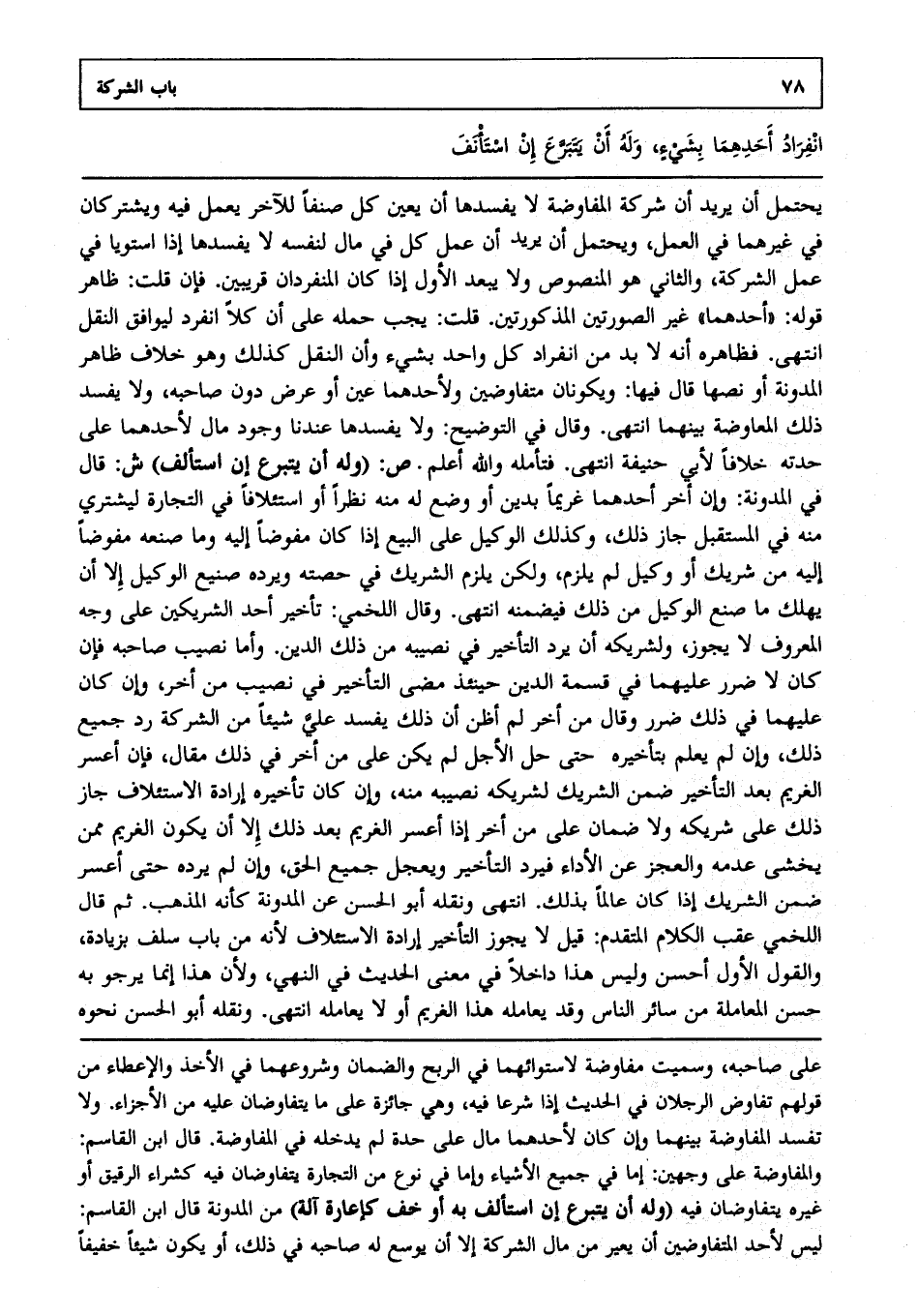 يحتمل أن يريد أن شركة المفاوضة لا يفسدها أن يعين كل صنفا للآخر يعمل فيه، ويشتركان في غيرهما في العمل ويحتمل أن يريد إن عمل كل في مال لنفسه لا يفسدها إذا استويا في عمل الشركة، والثاني هو المنصوص، ولا يبعد الأول إذا كان المنفردان قريبين فإن قلت: ظاهر قوله: "أحدهما" غير الصورتين المذكورتين قلت: يجب حمله على أن كلا انفرد ليوافق النقل انتهى. فظاهره أنه لا بد من انفراد كل واحد بشيء وأن النقل كذلك، وهو خلاف ظاهر المدونة، أو نصها قال فيها: ويكونان متفاوضين، ولأحدهما عين، أو عرض دون صاحبه، ولا يفسد ذلك المعاوضة بينهما انتهى. وقال في التوضيح: ولا يفسدها عندنا وجود مال لأحدهما على حدته خلافا لأبي حنيفة انتهى. فتأمله، والله أعلم. ص: (وله أن يتبرع إن استألف) ش: قال في المدونة: وإن أخر أحدهما غريما بدين، أو وضع له منه نظرا، أو استئلافا في التجارة ليشتري منه في المستقبل جاز ذلك، وكذلك الوكيل على البيع إذا كان مفوضا إليه وما صنعه مفوضا إليه من شريك، أو وكيل لم يلزم ولكن يلزم الشريك في حصته ويرده صنيع الوكيل إلا أن يهلك ما صنع الوكيل من ذلك، فيضمنه انتهى. وقال اللخمي: تأخير أحد الشريكين على وجه المعروف لا يجوز ولشريكه أن يرد التأخير في نصيبه من ذلك الدين، وأما نصيب صاحبه فإن كان لا ضرر عليهما في قسمة الدين حينئذ مضى التأخير في نصيب من أخر، وإن كان عليهما في ذلك ضرر، وقال من أخر: لم أظن أن ذلك يفسد علي شيئا من الشركة رد جميع ذلك، وإن لم يعلم بتأخيره حتى حل الأجل لم يكن على من أخر في ذلك مقال فإن أعسر الغريم بعد التأخير ضمن الشريك لشريكه نصيبه منه، وإن كان تأخيره إرادة الاستئلاف جاز ذلك على شريكه، ولا ضمان على من أخر إذا أعسر الغريم بعد ذلك إلا أن يكون الغريم ممن يخشى عدمه والعجز عن الأداء فيرد التأخير ويعجل جميع الحق، وإن لم يرده حتى أعسر ضمن الشريك إذا كان عالما بذلك انتهى. ونقله أبو الحسن عن المدونة كأنه المذهب ثم قال اللخمي عقب الكلام المتقدم قيل: لا يجوز التأخير لإرادة الاستئلاف، لأنه من باب سلف بزيادة، والقول الأول أحسن وليس هذا داخلا في معنى الحديث في النهي ولأن هذا إنما يرجو به حسن المعاملة من سائر الناس، وقد يعامله هذا الغريم، أو لا يعامله انتهى. ونقله أبو الحسن نحوه