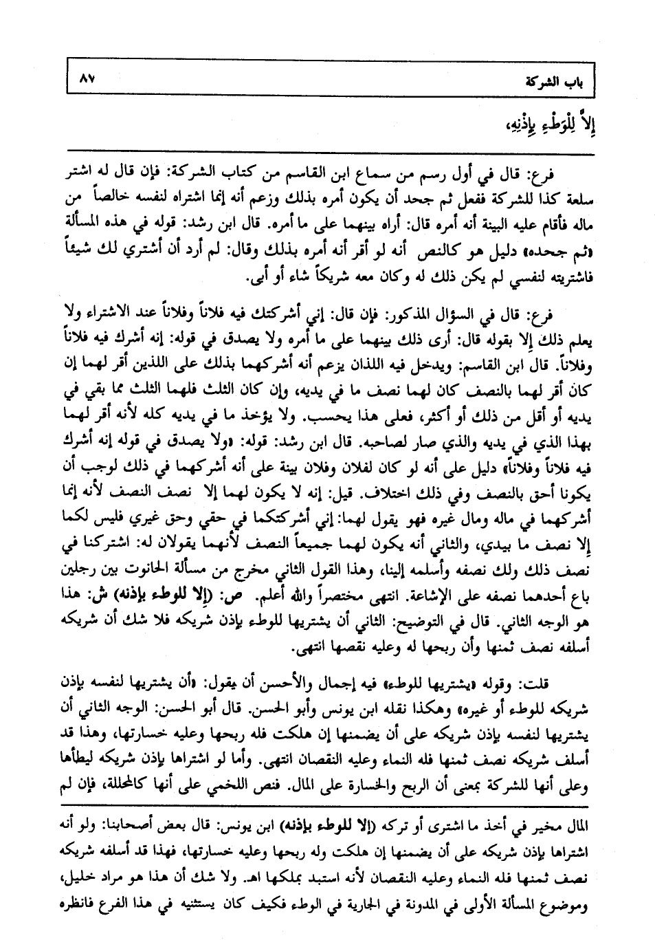 فرع: قال في السؤال المذكور: فإن قال: إني أشركتك فيه فلانا وفلانا عند الاشتراء، ولا يعلم ذلك إلا بقوله قال: "أرى ذلك بينهما على ما أمره، ولا يصدق في قوله إنه أشرك فيه" فلانا وفلانا قال ابن القاسم: ويدخل فيه اللذان يزعم أنه أشركهما بذلك على اللذين أقر لهما إن كان أقر لهما بالنصف كان لهما نصف ما في يديه، وإن كان الثلث فلهما الثلث مما بقي في يديه، أو أقل من ذلك، أو أكثر فعلى هذا يحسب، ولا يؤخذ ما في يديه كله؛ لأنه أقر لهما بهذا الذي في يديه، والذي صار لصاحبه قال ابن رشد: قوله: ولا يصدق في قوله إنه أشرك فيه فلانا وفلانا دليل على أنه لو كان لفلان وفلان بينة على أنه أشركهما في ذلك لوجب أن يكونا أحق بالنصف وفي ذلك اختلاف قيل: إنه لا يكون لهما إلا نصف النصف؛ لأنه إنما أشركهما في ماله، ومال غيره فهو يقول لهما إني أشركتكما في حقي وحق غيري فليس لكما إلا نصف ما بيدي والثاني أنه يكون لهما جميعا النصف؛ لأنهما يقولان له اشتركنا في نصف ذلك ولك نصفه وأسلمه إلينا، وهذا القول الثاني مخرج من مسألة الحانوت بين رجلين باع أحدهما نصفه على الإشاعة انتهى. مختصرا، والله أعلم. ص: (إلا للوطء بإذنه) ش: هذا هو الوجه الثاني قال في التوضيح الثاني أن يشتريها للوطء بإذن شريكه فلا شك أن شريكه أسلفه نصف ثمنها وأن ربحها له وعليه نقصها انتهى.