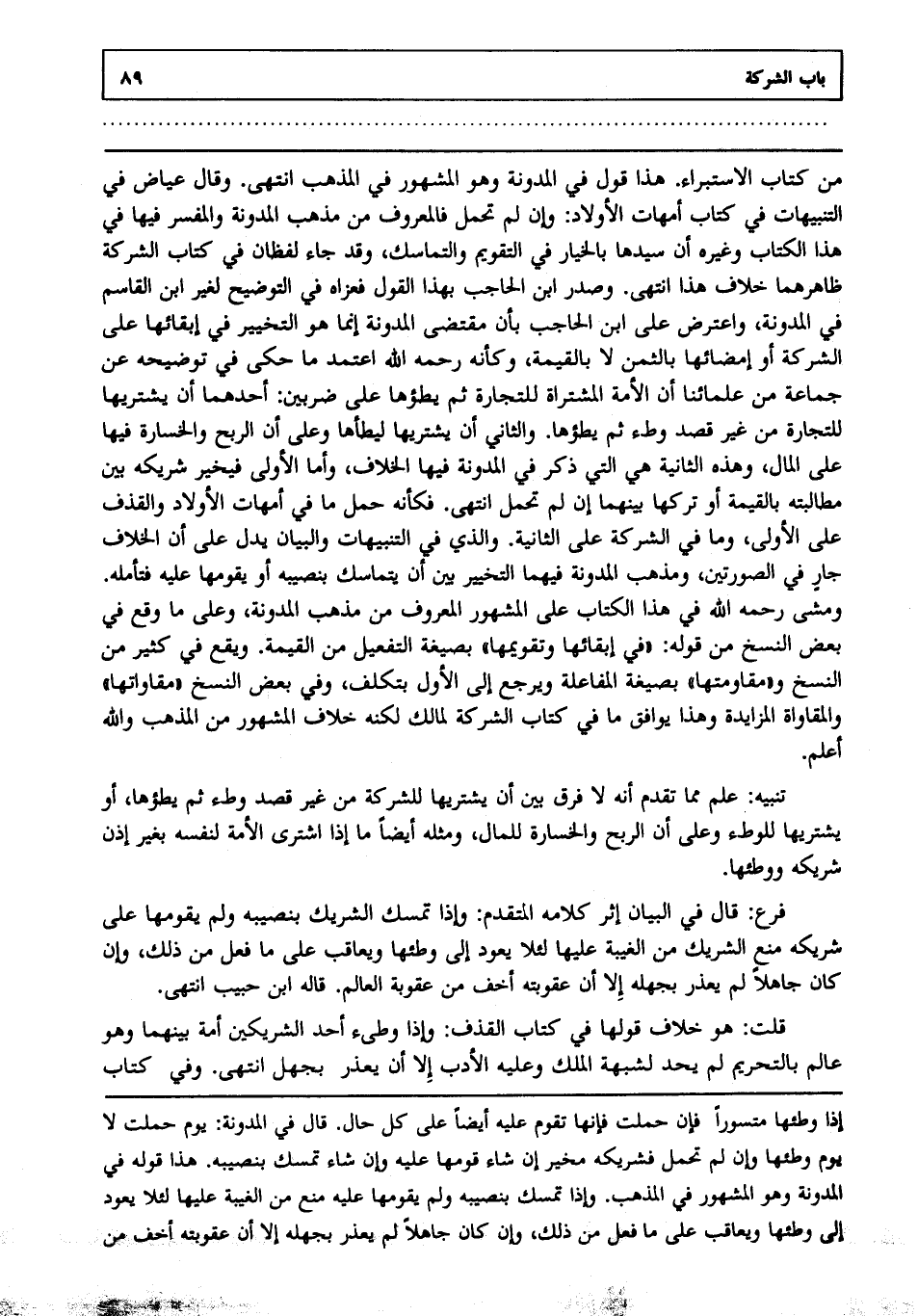 تنبيه: علم مما تقدم أنه لا فرق بين أن يشتريها للشركة من غير قصد وطء ثم يطأها، أو يشتريها للوطء، وعلى أن الربح والخسارة للمال، ومثله أيضا ما إذا اشترى الأمة لنفسه بغير إذن شريكه، ووطئها.