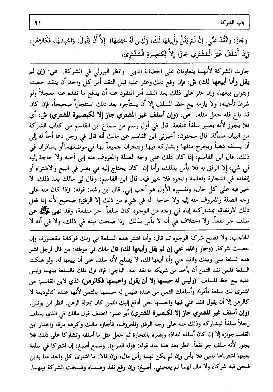 جازت الشركة؛ لأنهما يتعاونان على الحضانة انتهى. وانظر البرزلي في الشركة. ص: (إن لم يقل وأنا أبيعها لك) ش: فإن وقع ذلك وعثر عليه قبل النقد أمر كل واحد أن ينقد حصته ويتولى بيعها، وإن عثر على ذلك بعد النقد أمر المنقود عنه أن يدفع ما نقده عنه معجلا، ولو شرط تأجيله، ولا يلزمه بيع حظ المسلف إلا أن يستأجره بعد ذلك استئجارا صحيحا فإن كان قد باع فله جعل مثله. ص: (وإن أسلف غير المشتري جاز إلا لكبصيرة المشتري) ش: أي فلا يجوز؛ لأنه يصير سلفا بمنفعة قال في أول رسم من سماع ابن القاسم من كتاب الشركة من البيان: مسألة قال سحنون: أخبرني ابن القاسم عن مالك أنه قال في رجل دعا أخا له إلى أن يسلفه ذهبا ويخرج مثلها ويشاركه فيها ويتجران جميعا بها في موضعهما، أو يسافران في ذلك قال ابن القاسم: إذا كان ذلك على وجه الصلة، والمعروف منه إلى أخيه، ولا حاجة إليه في شيء إلا الرفق به فلا بأس بذلك وأما إن كان يحتاج إليه في بصر في البيع والاشتراء، أو إنفاذه في التجارة ولعمله ونحوه فلا خير فيه. قال ابن القاسم: وقال لي مالك بعد ذلك: لا خير فيه على كل حال وتفسيره الأول هو أحب إلي قال ابن رشد: قوله: "إذا كان منه على وجه الصلة، والمعروف منه إليه، ولا حاجة له في شيء من ذلك إلا الرفق" صحيح لأنه إذا فعل ذلك لارتفاقه بمشاركته إياه في وجه من الوجوه كان سلفا جر منفعة، وقد نهى صلى الله عليه وسلم عن سلف جر نفعا، ولا اختلاف في أنه لا بأس بذلك إذا صحت نيته في ذلك، ولا في أنه لا