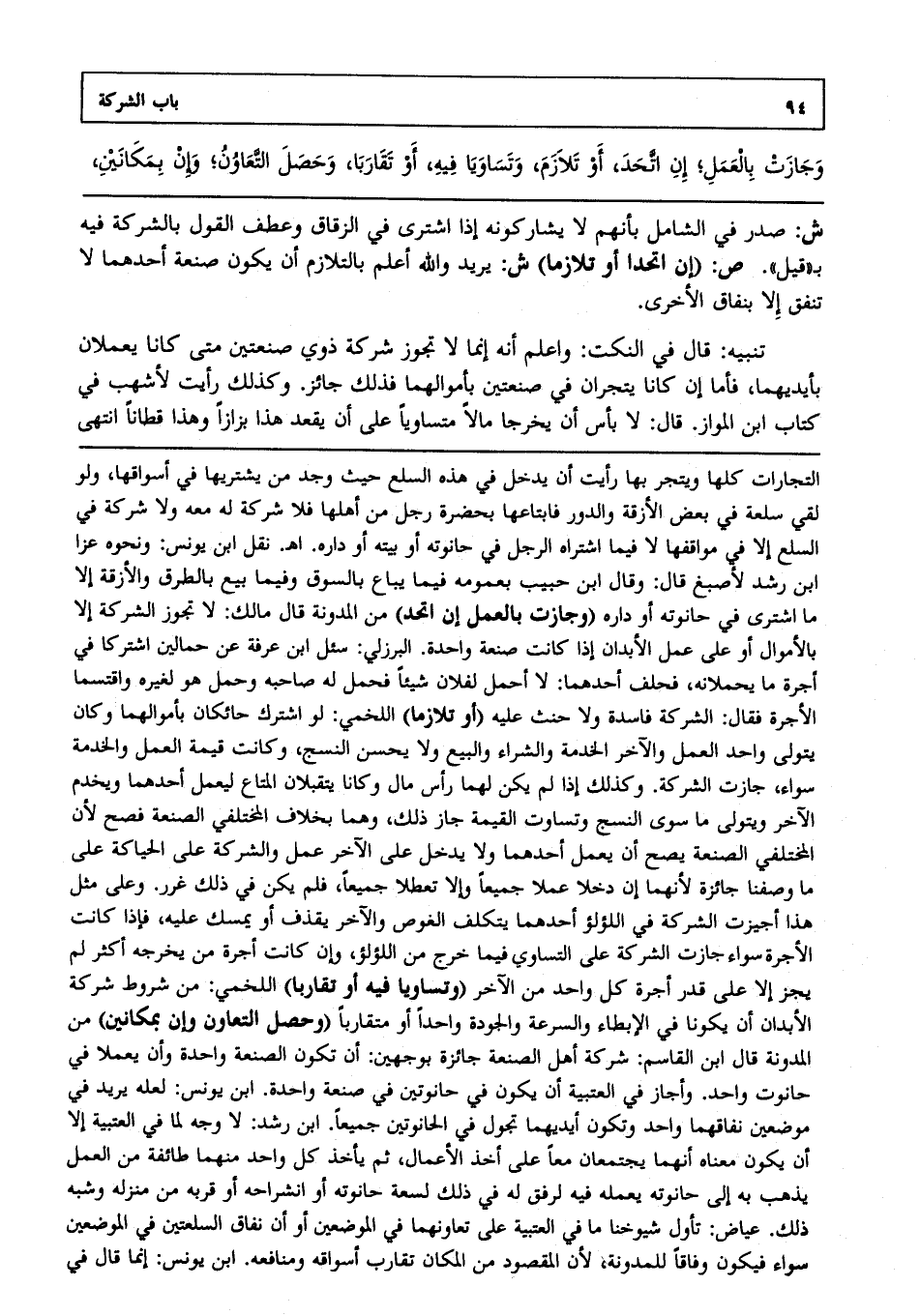 ش: صدر في الشامل بأنهم لا يشاركونه إذا اشترى في الزقاق وعطف القول بالشركة فيه بـ"قيل". ص: (إن اتحدا، أو تلازما) ش: يريد والله أعلم بالتلازم أن يكون صنعة أحدهما لا تنفق إلا بنفاق الأخرى