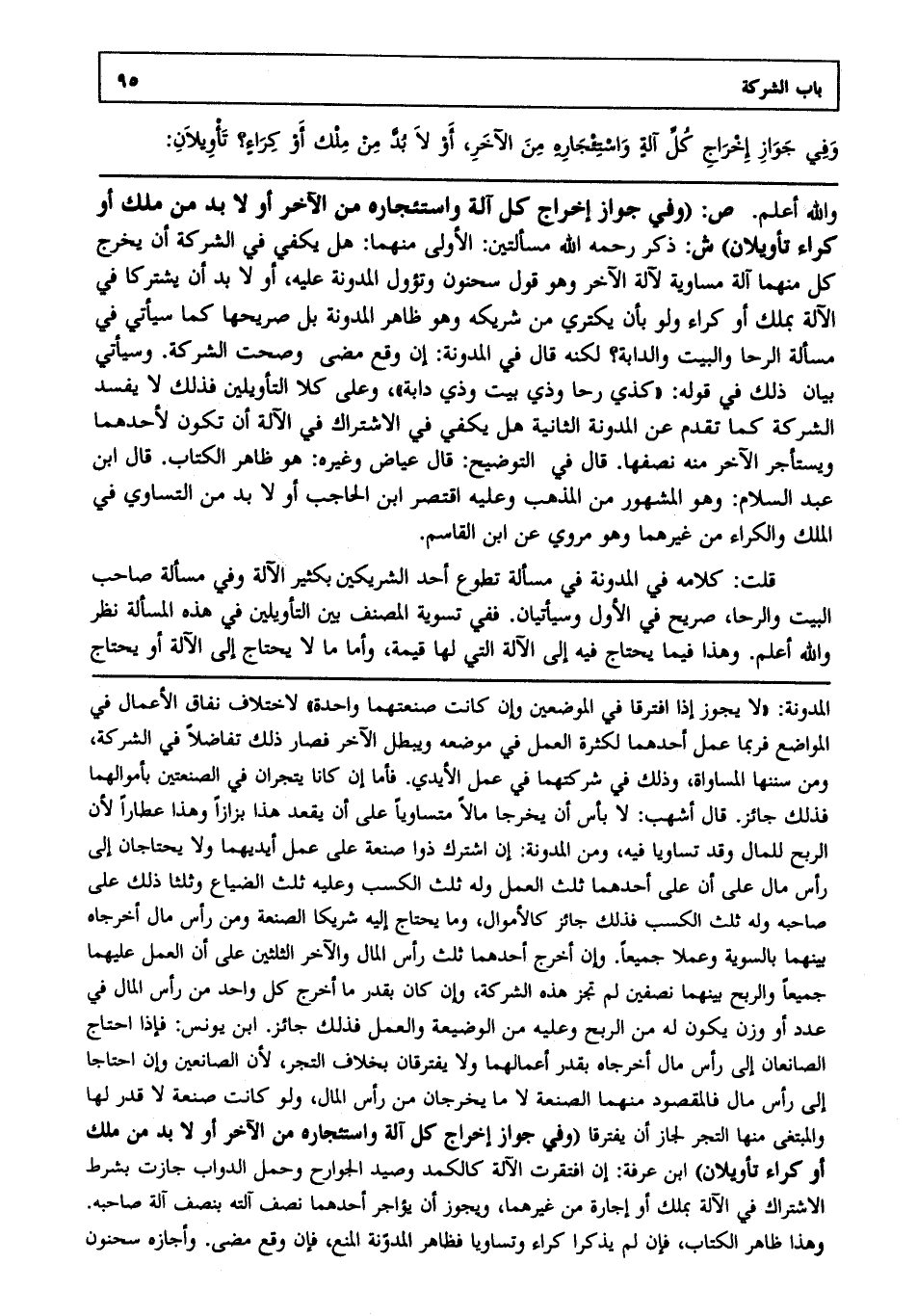 والله أعلم. ص: (وفي جواز إخراج كل آلة واستئجاره من الآخر، أو لا بد من ملك، أو كراء تأويلان) ش: ذكر - رحمه الله – مسألتين: الأولى منهما: هل يكفي في الشركة أن يخرج كل منهما آلة مساوية لآلة الآخر وهو قول سحنون وتؤول المدونة عليه، أو لا بد أن يشتركا في الآلة بملك، أو كراء، ولو بأن يكتري من شريكه وهو ظاهر المدونة بل صريحها كما سيأتي في مسألة الرحى والبيت، والدابة لكنه قال في المدونة إن وقع مضى، وصحت الشركة، وسيأتي بيان ذلك في قوله: "كذي رحى وذي بيت وذي دابة"، وعلى كلا التأويلين فذلك لا يفسد الشركة كما تقدم عن المدونة الثانية هل يكفي في الاشتراك في الآلة أن تكون لأحدهما، ويستأجر الآخر منه نصفها قال في التوضيح قال عياض وغيره: هو ظاهر الكتاب قال ابن عبد السلام: وهو المشهور من المذهب، وعليه اقتصر ابن الحاجب، أو لا بد من التساوي في الملك والكراء من غيرهما وهو مروي عن ابن القاسم
