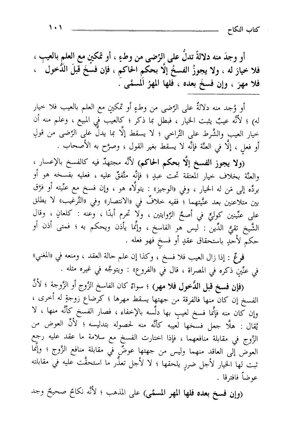 "ولا يجوز الفسخ إلا بحكم الحاكم" لأنه مجتهد فيه كالفسخ بالإعسار والعنة بخلاف خيار المعتقة تحت عبد فإنه متفق عليه فعليه بفسخه هو أو برده إلى من له الخيار وفي "الوجيز" يتولاه هو وإن فسخ مع عنيته أو فرق بين متلاعنين بعد عنيتهما ففيه خلاف في "الانتصار" وفي "الترغيب" لا يطلق على عنينين كولي في أصح الروايتين ولا تحرم أبدا وعنه: كلعان وقال الشيخ تقي الدين ليس هو الفاسخ وإنما يأذن ويحكم به فمتى أذن أو حكم لأحد باستحقاق عقد أو فسخ فهو فعله.