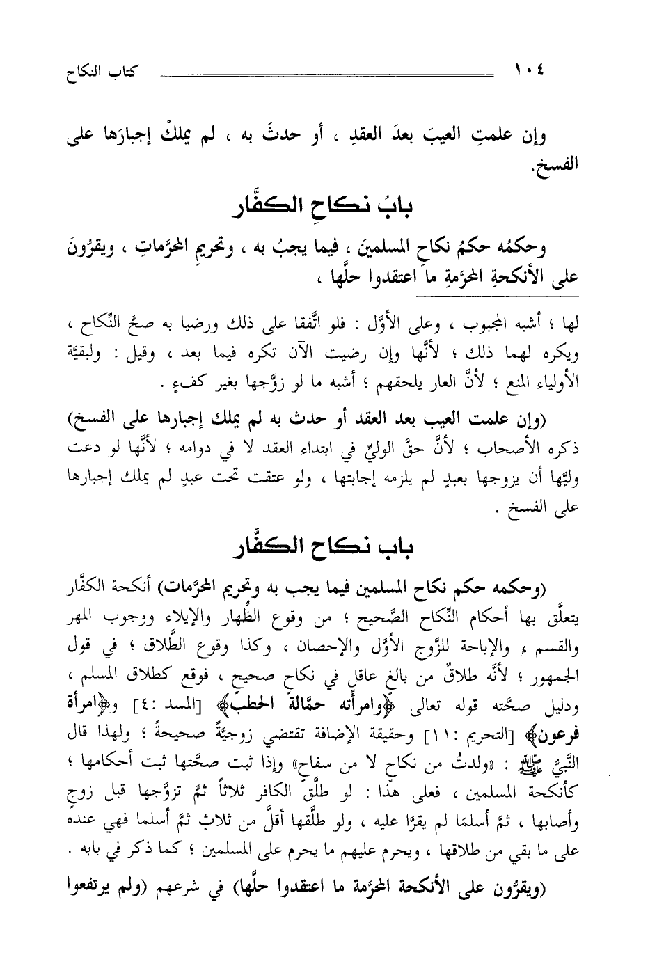 "وحكمه حكم نكاح المسلمين فيما يجب به وتحريم المحرمات" أنكحة الكفار يتعلق بها أحكام النكاح الصحيح من وقوع الظهار والإيلاء ووجوب المهر والقسم والإباحة للزوج الأول والإحصان وكذا وقوع الطلاق في قول الجمهور لأنه طلاق من بالغ عاقل في نكاح صحيح فوقع كطلاق المسلم ودليل صحته قوله تعالى: {وَامْرَأَتُهُ حَمَّالَةَ الْحَطَبِ} [المسد:4] و{ امْرَأَتَ فِرْعَوْنَ} [التحريم: من الآية11] وحقيقة الإضافة تقتضي زوجية صحيحة ولهذا قال النبي صلى الله عليه وسلم: "ولدت من نكاح لا من سفاح" وإذا ثبت صحتها ثبت أحكامها كأنكحة المسلمين فعلى هذا لو طلق الكافر ثلاثا ثم تزوجها قبل زوج وأصابها ثم أسلما لم يقرا عليه ولو طلقها أقل من ثلاث ثم أسلما فهي عنده على ما بقي من طلاقها ويحرم عليهم ما يحرم على المسلمين كما ذكر في بابه.