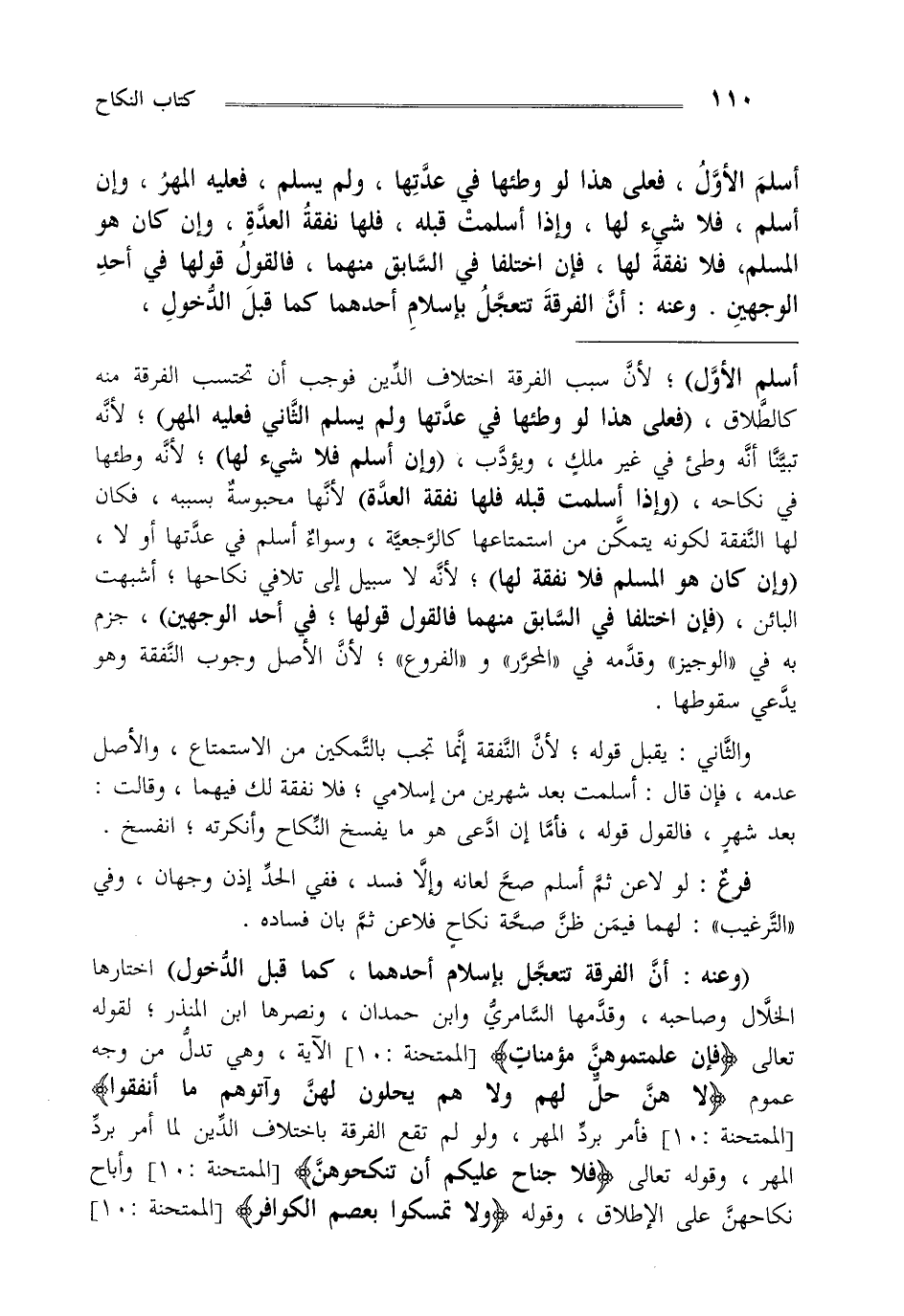 "وعنه أن الفرقة تتعجل بإسلام أحدهما كما قبل الدخول" اختارها الخلال وصاحبه وقدمها السامري وابن حمدان ونصرها ابن المنذر لقوله تعالى: { فَإِنْ عَلِمْتُمُوهُنَّ مُؤْمِنَاتٍ} [الممتحنة: من الآية10] الآية وهي تدل من وجه عموم {لا هُنَّ حِلٌّ لَهُمْ وَلا هُمْ يَحِلُّونَ لَهُنَّ وَآتُوهُمْ مَا أَنْفَقُوا} [الممتحنة: من الآية10]