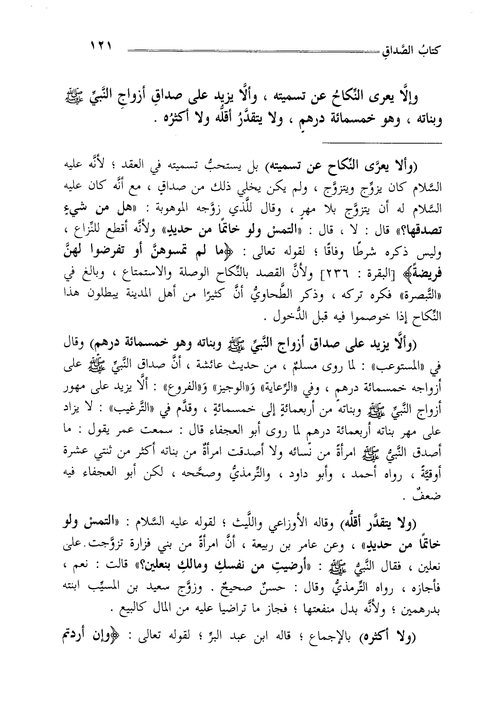 "وألا يزيد على صداق أزواج النبي صلى الله عليه وسلم وبناته وهو خمسمائة درهم" وقال في "المستوعب" لما روى مسلم من حديث عائشة أن صداق النبي صلى الله عليه وسلم على أزواجه خمسمائة درهم وفي "الرعاية" و "الوجيز" و "الفروع" ألا يزيد على مهور أزواج النبي صلى الله عليه وسلم وبناته من أربعمائة إلى خمسمائة وقدم في "الترغيب" لا يزاد على مهر بناته أربعمائة درهم لما روى أبو العجفاء قال سمعت عمر يقول ما أصدق النبي صلى الله عليه وسلم امرأة من نسائه ولا أصدقت امرأة من بناته أكثر من ثنتي عشرة أوقية رواه أحمد وأبو داود والترمذي وصححه لكن أبو العجفاء فيه ضعف.