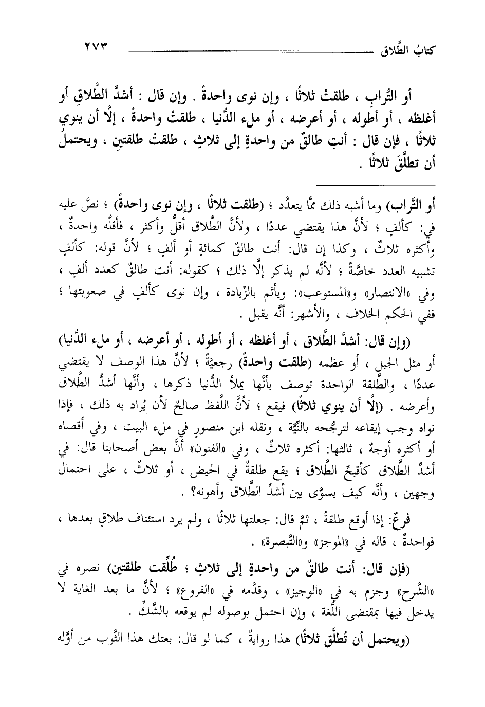 "وإن قال أشد الطلاق أو أغلظه أو أطوله أو أعرضه أو ملء الدنيا" أو مثل الجبل أو عظمه "طلقت واحدة" رجعية لأن هذا الوصف لا يقتضي عددا والطلقة الواحدة توصف بأنها يملأ الدنيا ذكرها وأنها أشد الطلاق وأعرضه "إلا أن ينوي ثلاثا" فيقع لأن اللفظ صالح لأن يراد به ذلك فإذا نواه وجب إيقاعه لترجحه بالنية ونقله ابن منصور في ملء البيت وفي أقصاه أو أكثره أوجه ثالثها أكثره ثلاث وفي "الفنون" أن بعض أصحابنا قال في أشد الطلاق كأقبح الطلاق يقع طلقة في الحيض أو ثلاث على احتمال وجهين وأنه كيف يسوى بين أشد الطلاق وأهونه.