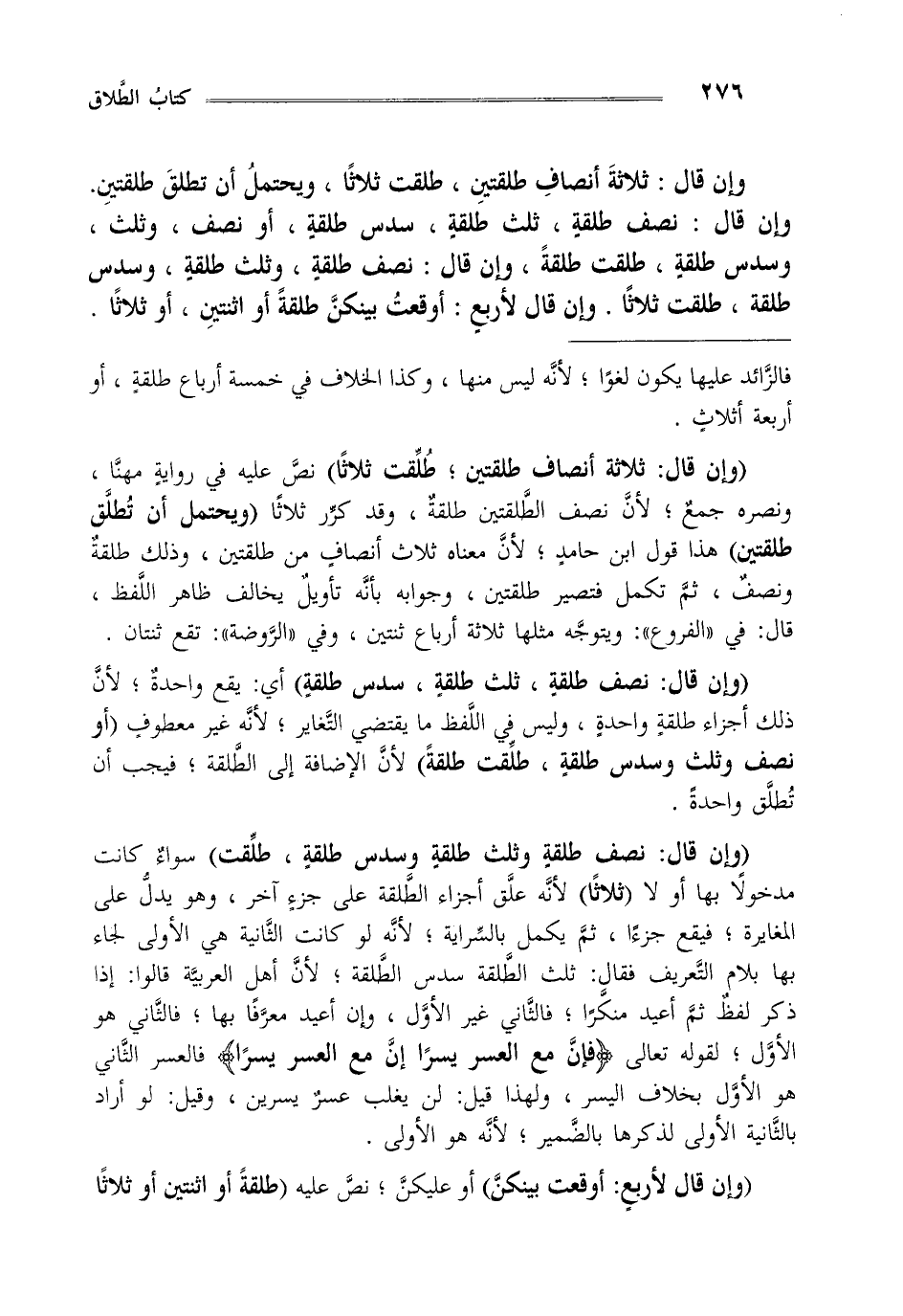"وإن قال ثلاثة أنصاف طلقتين طلقت ثلاثا" نص عليه في رواية منها ونصره جمع لأن نصف الطلقتين طلقة وقد كرر ثلاثا "ويحتمل أن تطلق طلقتين" هذا قول ابن حامد لأن معناه ثلاث أنصاف من طلقتين وذلك طلقة ونصف ثم تكمل فتصير طلقتين وجوابه بأنه تأويل يخالف ظاهر اللفظ قال في "الفروع" ويتوجه مثلها ثلاثة أرباع ثنتين وفي "الروضة" تقع ثنتان.