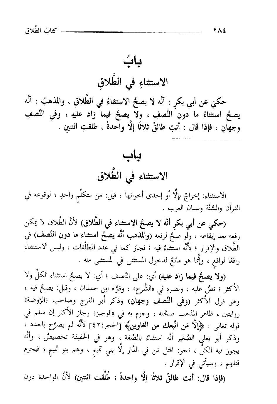 "العرب حكي عن أبي بكر أنه لا يصح الاستثناء في الطلاق" لأن الطلاق لا يمكن رفعه بعد إيقاعه ولو صح لرفعه "والمذهب أنه يصح استثناء ما دون النصف" في الطلاق والإقرار لأنه استثناء فيه فجاز كما في عدد المطلقات وليس الاستنثناء رافعا لواقع وإنما هو مانع لدخول المستثنى في المستثنى منه.