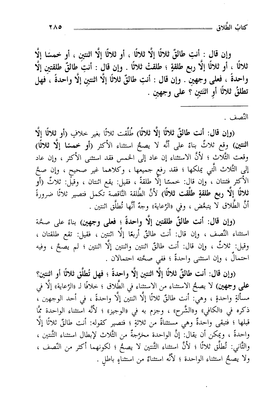 "وإن قال أنت طالق ثلاثا إلا ثلاثا طلقت ثلاثا" طلقت ثلاثا بغير خلاف "أو ثلاثا إلا اثنتين" وقع ثلاث بناء على أنه لا يصح استثناء الأكثر "أو خمسا إلا ثلاثا" وقعت الثلاث لأن الاستثناء إن عاد إلى الخمس فقد استثنى الأكثر وإن عاد إلى الثلاث التي يملكها فقد رفع جميعها وكلاهما غير صحيح وإن صح الأكثر فثنتان وإن قال خمسا إلا طلقة فقيل يقع اثنتان وقيل ثلاث "أو ثلاثا إلا ربع طلقة طلقة ثلاثا" لأن الطلقة الناقصة تكمل فتصير ثلاثا ضرورة أن الطلاق لا يتبعض وفي "الرعاية" وجه أنها تطلق اثنتين.