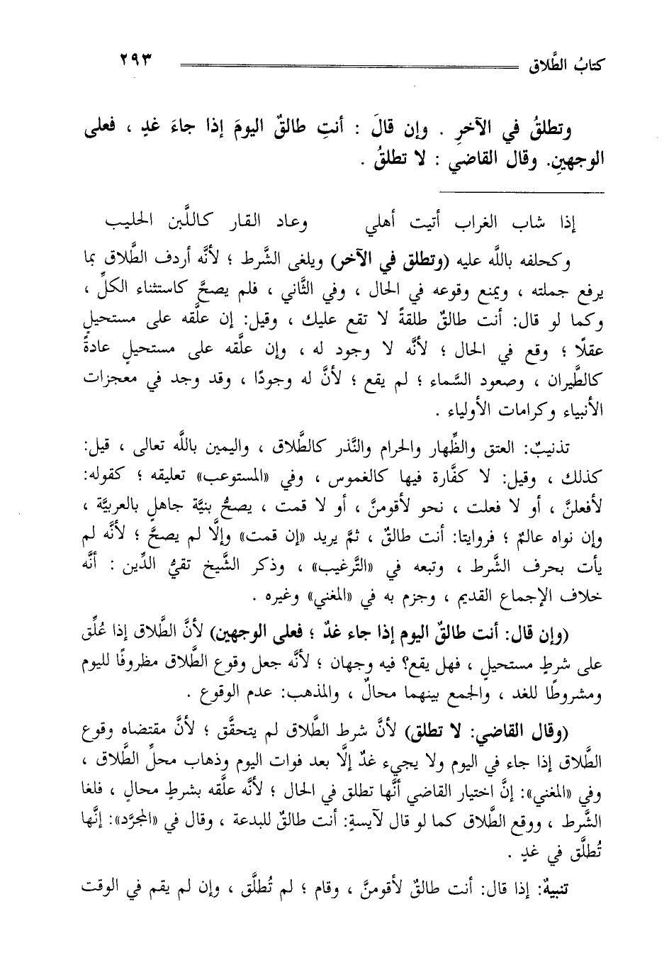 "وقال القاضي لا تطلق" لأن شرط الطلاق لم يتحقق لأن مقتضاه وقوع الطلاق إذا جاء في اليوم ولا يجيء غد إلا بعد فوات اليوم وذهاب محل الطلاق وفي "المغني" إن اختيار القاضي أنها تطلق في الحال لأنه علقه بشرط محال فلغا الشرط ووقع الطلاق كما لو قال لآيسة أنت طالق للبدعة وقال في "المجرد" إنها تطلق في غد.
