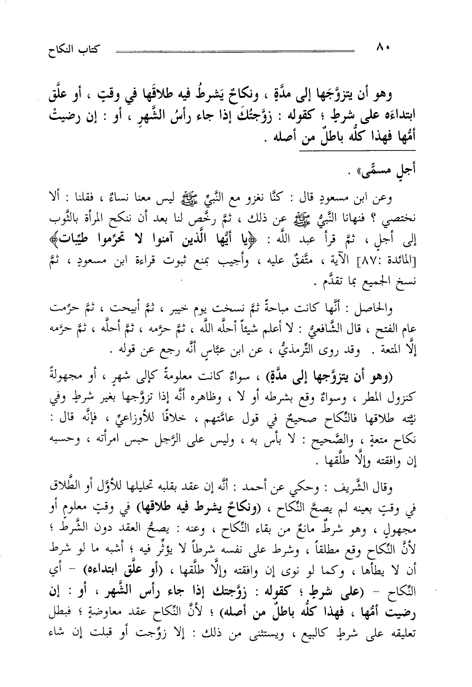 "وهو أن يتزوجها إلى مدة" سواء كانت معلومة كإلى شهر أو مجهولة كنزول المطر وسواء وقع بشرطه أو لا وظاهره أنه إذا تزوجها بغير شرط وفي نيته طلاقها فالنكاح صحيح في قول عامتهم خلافا للأوزاعي فإنه قال نكاح متعة والصحيح لا بأس به وليس على الرجل حبس امرأته وحسبه إن وافقته وإلا طلقها.