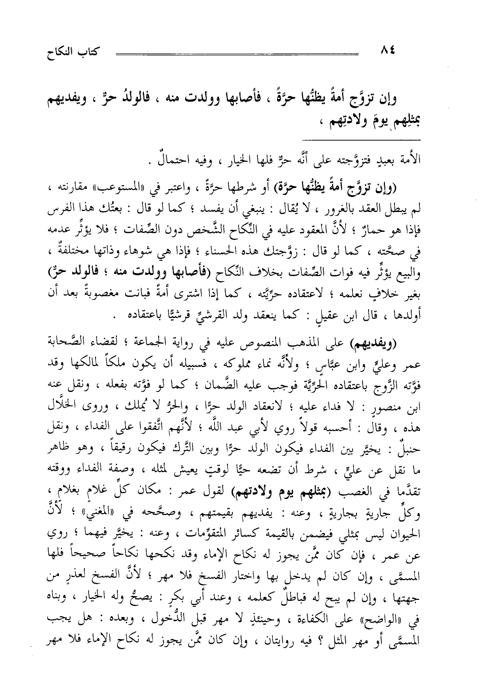 "وإن تزوج أمة يظنها حرة" أو شرطها حرة واعتبر في "المستوعب" مقارنته لم يبطل العقد بالغرور لا يقال ينبغي أن يفسد كما لو قال بعتك هذا الفرس فإذا هو حمار لأن المعقود عليه في النكاح الشخص دون الصفات فلا يؤثر عدمه في صحته كما لو قال زوجتك هذه الحسناء فإذا هي شوهاء وذاتها مختلفة والبيع يؤثر فيه فوات الصفات بخلاف النكاح "فأصابها وولدت منه فالولد حر" بغير خلاف نعلمه لاعتقاده حريته كما إذا اشترى أمة فبانت مغصوبة بعد أو أولدها قال ابن عقيل كما ينعقد ولد القرشي قرشيا باعتقاده. "ويفديهم" على المذهب المنصوص عليه في رواية الجماعة لقضاء الصحابة عمر وعلي وابن عباس ولأنه نماء مملوكه فسبيله أن يكون ملكا لمالكها وقد فوته الزوج باعتقاده الحرية فوجب عليه الضمان كما لو فوته بفعله ونقل عنه ابن منصور لا فداء عليه لانعقاد الولد حرا والحر لا يملك وروى الخلال هذه وقال أحسبه قولا روي لأبي عبد الله لأنهم اتفقوا على الفداء ونقل حنبل يخير بين الفداء فيكون الولد حرا وبين الترك فيكون رقيقا وهو ظاهر ما نقل عن علي شرط أن تضعه حيا لوقت يعيش لمثله وصفة الفداء ووقته تقدما في الغصب "بمثلهم يوم ولادتهم" لقول عمر مكان كل غلام بغلام وكل جارية بجارية وعنه: يفديهم بقيمتهم وصححه في "المغني" لأن الحيوان ليس بمثلي فيضمن بالقيمة كسائر المتقومات وعنه: يخير فيهما روي عن عمر فإن كان ممن يجوز له نكاح الإماء وقد نكحها نكاحا صحيحا فلها المسمى وإن كان لم يدخل بها واختار الفسخ فلا مهر لأن الفسخ لعذر من جهتها وإن لم يبح فباطل كعلمه وعند أبي بكر يصح وله الخيار وبناه في "الواضح" على الكفاءة وحينئذ لا مهر قبل الدخول وبعده هل يجب المسمى أو مهر المثل فيه روايتان وإن كان ممن يجوز له نكاح الإماء فلا مهر