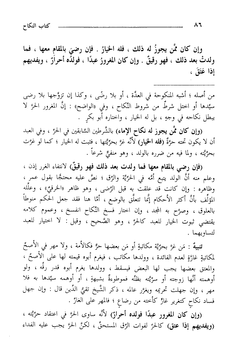 من أصله أشبه المنكوحة في العدة أو بلا رضى وكذا إن تزوجها بلا رضى سيدها أو اختل شرط من شروط النكاح وفي "الواضح" إن المغرور الحر لا يبطل نكاحه في وجه بل له الخيار واختاره أبو بكر.