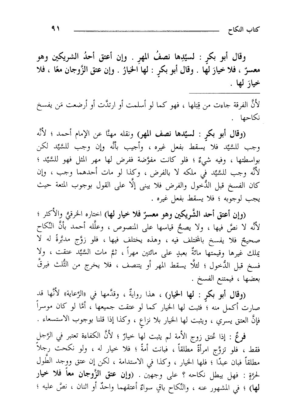 "وإن أعتق أحد الشريكين وهو معسر فلا خيار لها" اختاره الخرقي والأكثر لأنه لا نص فيها ولا يصح قياسها على المنصوص وعلله أحمد بأن النكاح صحيح فلا يفسخ بالمختلف فيه وهذه يختلف فيها فلو زوج مدبرة له لا يملك غيرها وقيمتها مائة بعبد على مائتين مهرا ثم مات السيد عتقت ولا فسخ قبل الدخول لئلا يسقط المهر أو يتنصف فلا يخرج من الثلث فيرق بعضها فيمتنع الفسخ.