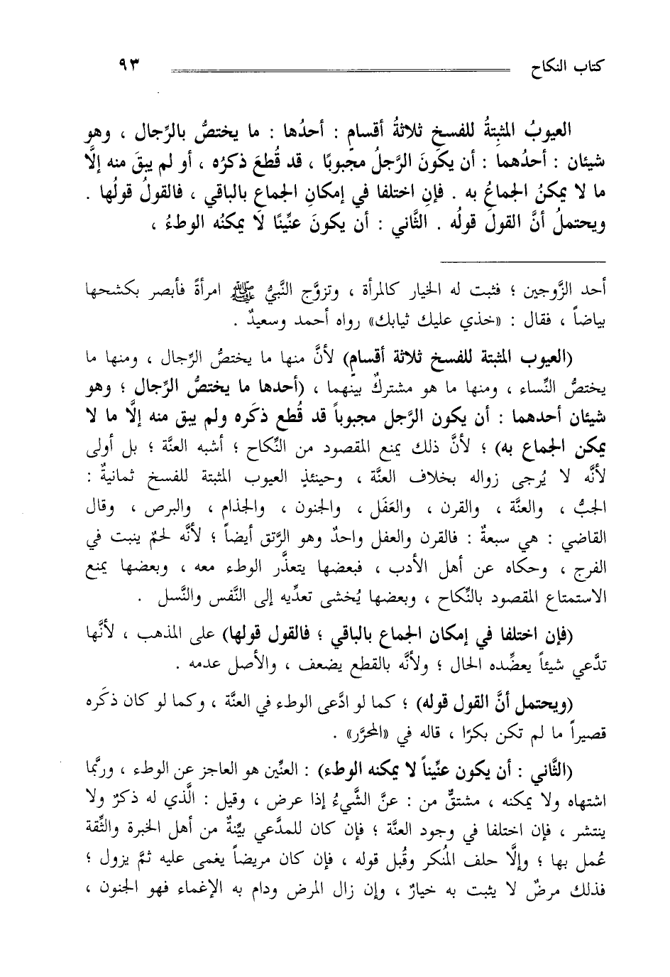 العيوب المثبتة للفسخ ثلاثة أقسام: أحدها: ما يختص بالرجال وهو شيئان: أحدهما: أن يكون الرجل مجبوبا قد قطع ذكره أو لم يبق منه إلا ما لا يمكن الجماع به فإن اختلفا في إمكان الجماع بالباقي فالقول قولها، ويحتمل أن القول قوله، الثاني: أن يكون عنينا لا يمكنه الوطء،