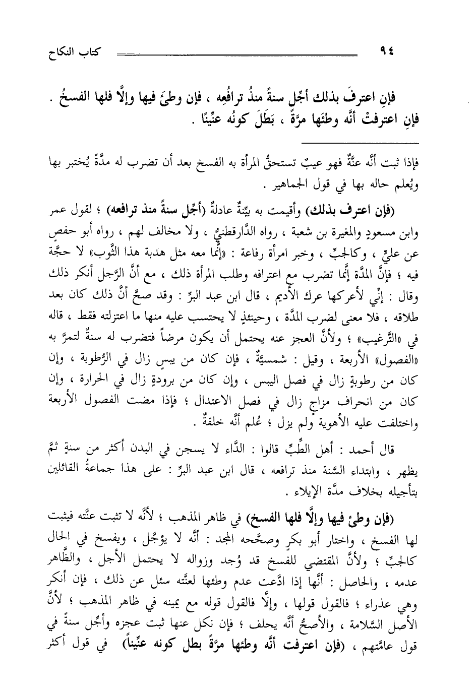 "فإن اعترف بذلك" وأقيمت به بينة عادلة "أجل سنة منذ ترافعه" لقول عمر وابن مسعود والمغيرة بن شعبة رواه الدارقطني ولا مخالف لهم رواه أبو حفص عن علي وكالجب وخبر امرأة رفاعة "إنما معه مثل هدبة هذا الثوب" لا حجة فيه فإن المدة إنما تضرب مع اعترافه وطلب المرأة ذلك مع أن الرجل أنكر ذلك وقال إني لأعركها عرك الأديم قال ابن عبد البر وقد صح أن ذلك كان بعد طلاقه فلا معنى لضرب المدة وحينئذ لا يحتسب عليه منها ما اعتزلته فقط قاله في "الترغيب" ولأن العجز عنه يحتمل أن يكون مرضا فتضرب له سنة لتمر به الفصول الأربعة وقيل شمسية فإن كان من يبس زال في الرطوبة وإن كان من رطوبة زال في فصل اليبس وإن كان من برودة زال في الحرارة وإن كان من انحراف مزاج زال في فصل الاعتدال فإذا مضت الفصول الأربعة واختلفت عليه الأهوية ولم يزل علم أنه خلقة. قال أحمد أهل الطب قالوا الداء لا يسجن في البدن أكثر من سنة ثم يظهر وابتداء السنة منذ ترافعه قال ابن عبد البر على هذا جماعة القائلين بتأجيله بخلاف مدة الإيلاء.