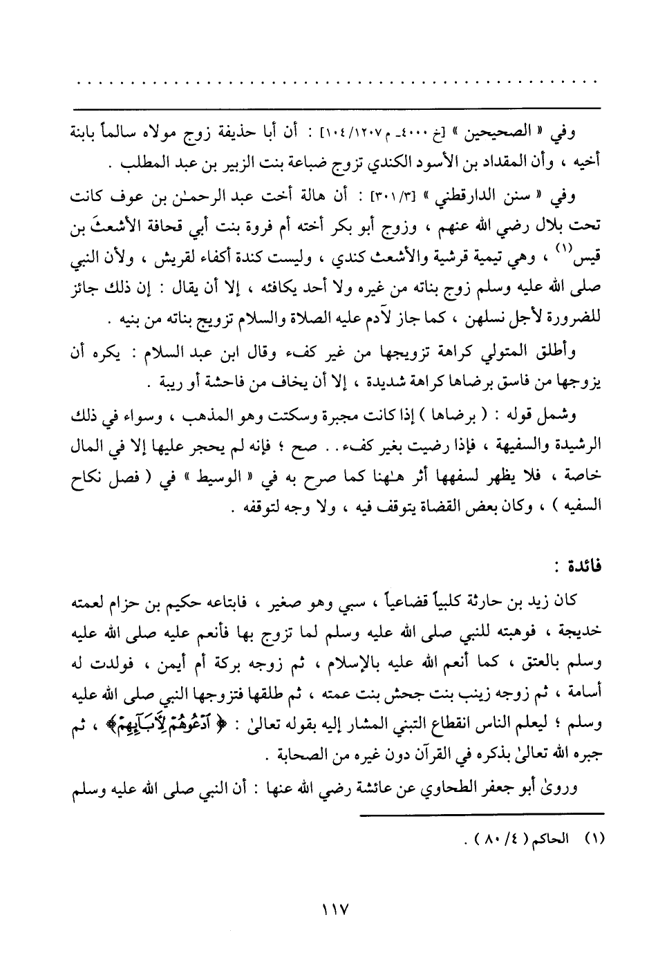 وفي (الصحيحين): أن أبا حذيفة زوج مولاه سالمًا بابنة أخيه، وأن المقداد بن الأسود الكندي تزوج ضباعة بنت الزبير بن عبد المطلب.