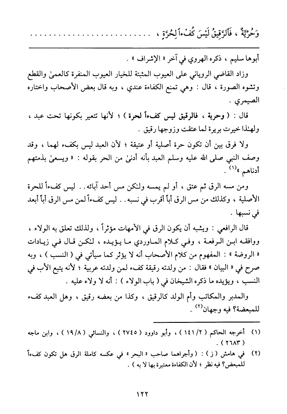 وَحُرِّيَّةٌ، فَالرَّقِيقُ لَيْسَ كُفْءًا لِحُرَّةٍ،