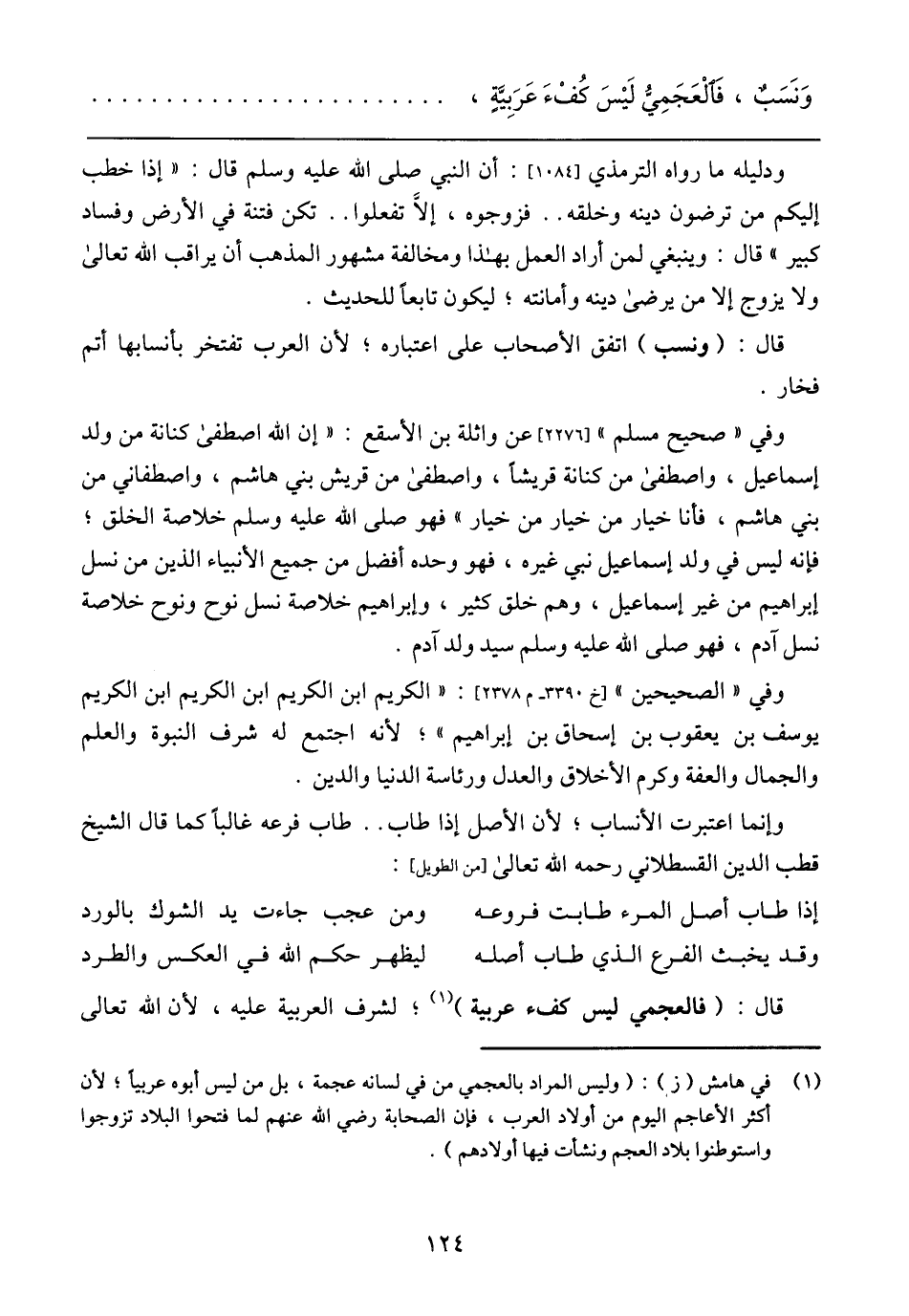 وَنَسَبٌ، فَالْعَجَمِيُّ لَيْسَ كُفْءَ عَرَبِيَّةٍ،