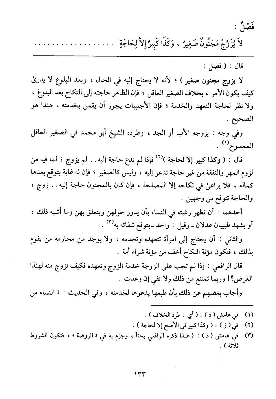 لاَ يُزَوَّجُ مَجْنُونٌ صَغِيرٌ، وَكَذَا كَبِيرٌ إِلاَّ لِحَاجَةٍ