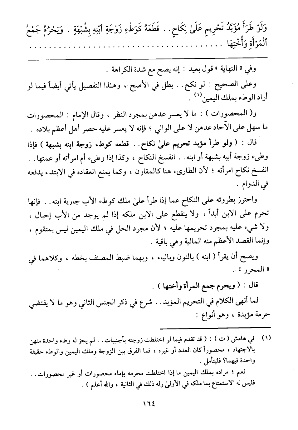 وَلَوْ طَرَأَ مُؤَبَدُ تَحْرِيمٍ عَلَى نِكَاحٍ .. قَطَعَهُ كَوَطْءِ زَوْجَةِ ابْنِهِ بِشُبْهَةٍ. وَيَحْرُمُ جَمْعُ الْمَرْأَةِ وَأُخْتِهَا