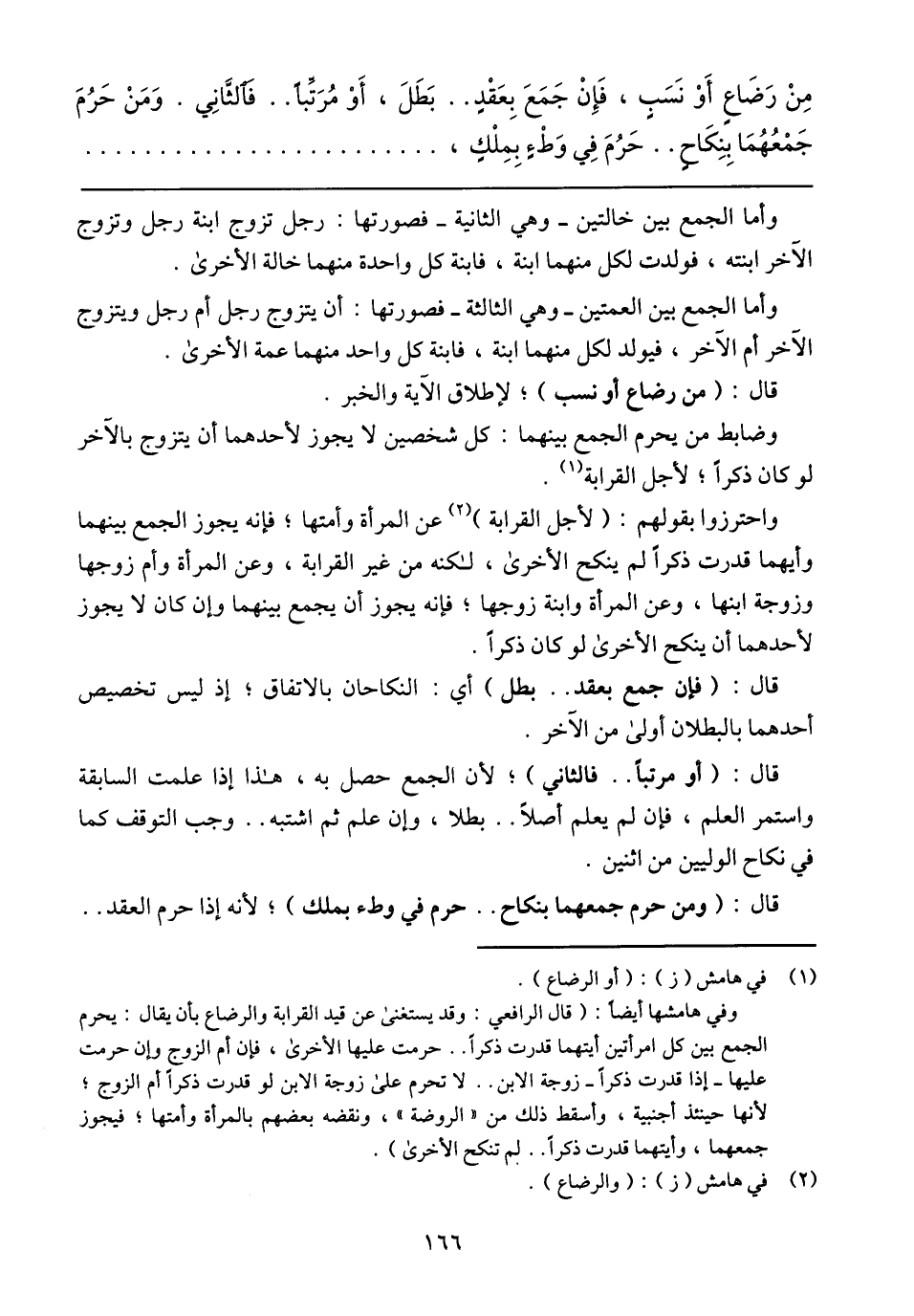 واحترزوا بقولهم: (لأجل القرابة) عن المرأة وأمتها؛ فإنه يجوز الجمع بينهما وأيهما قدرت ذكرًا لم ينكح الأخرى، لكنه من غير القرابة، وعن المرأة وأم زوجها وزوجة ابنها، وعن المرأة وابنة زوجها؛ فإنه يجوز أن يجمع بينهما وإن كان لا يجوز لأحدهما أن ينكح الأخرى لو كان ذكرًا.